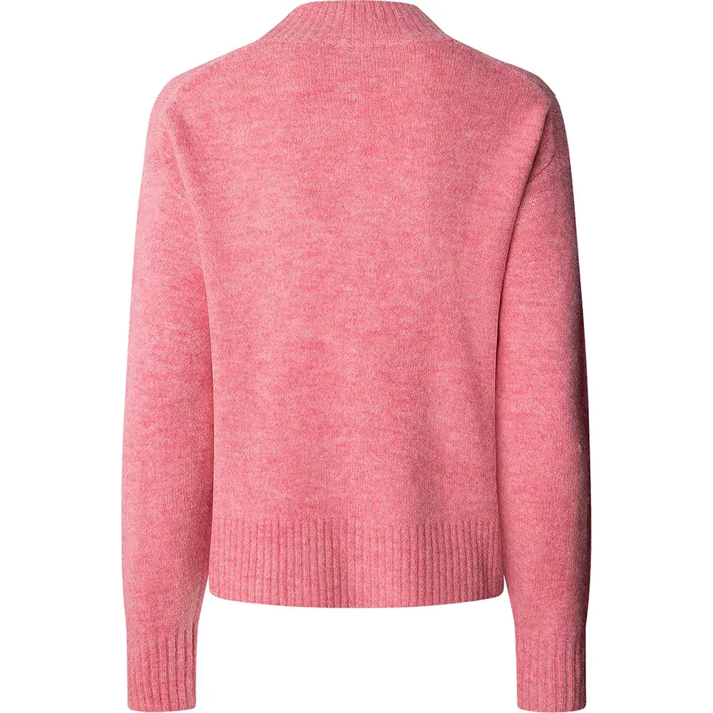 Трикотаж с круглым вырезом, длинными рукавами, резинкой на манжетах, воротником и подолом с боковыми разрезами, ажурной вышивкой по центру спинки.