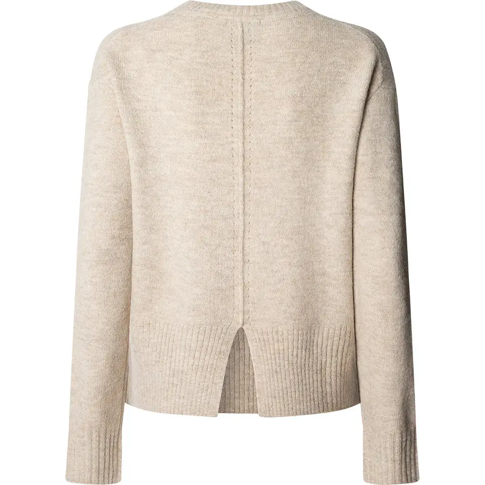 Трикотаж с круглым вырезом, длинными рукавами, резинкой на манжетах, воротнике и подоле, с полностью модными деталями на проймах и воротнике, разрезом сзади и ажурной отделкой по заднему шву.
