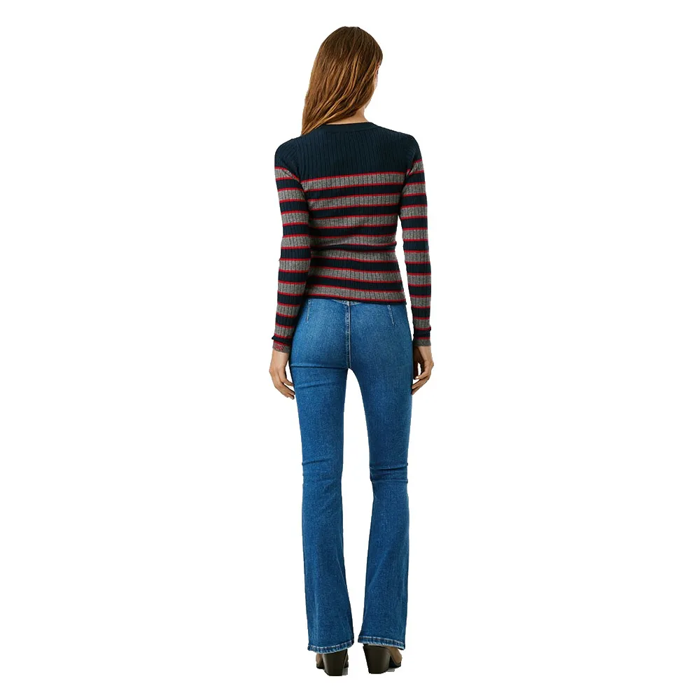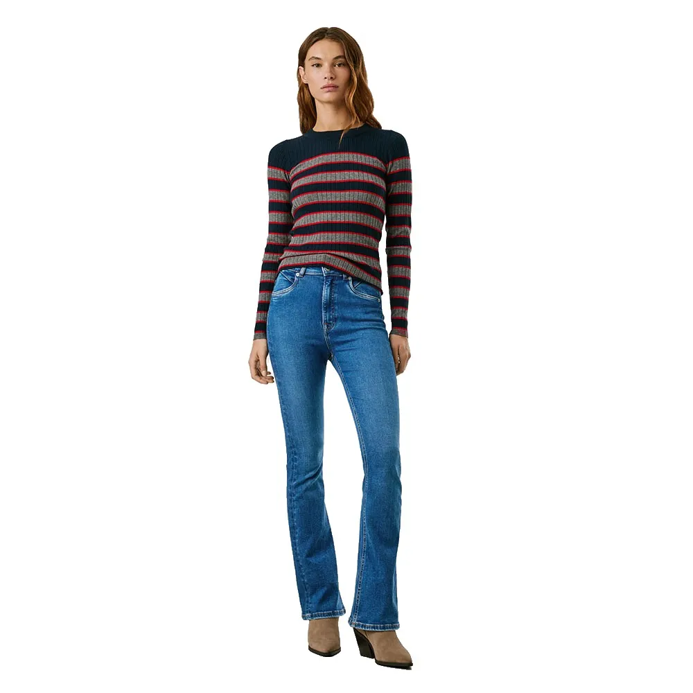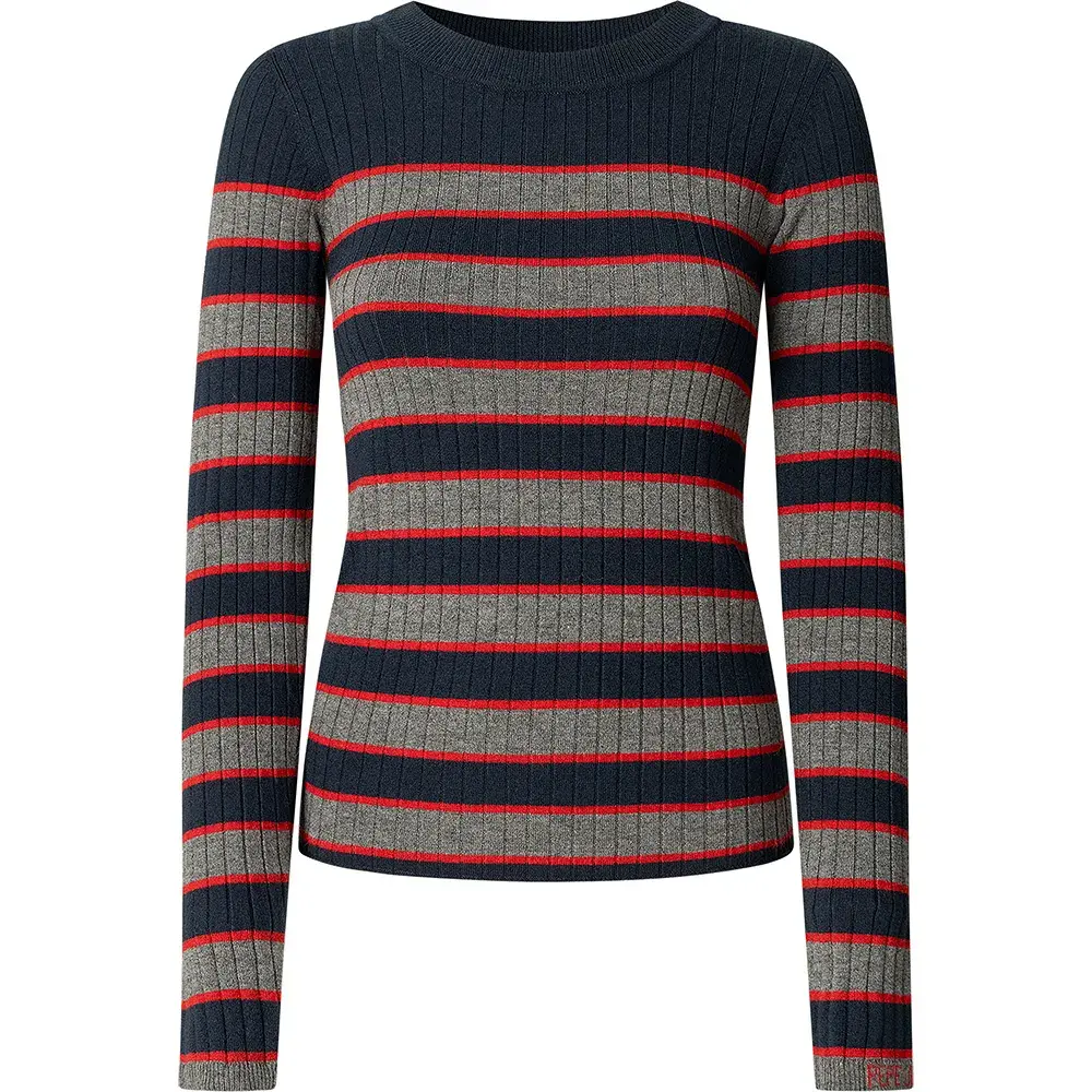 Круглый вырез, длинный рукав, плотная вязка в рубчик с полосками по всей поверхности.