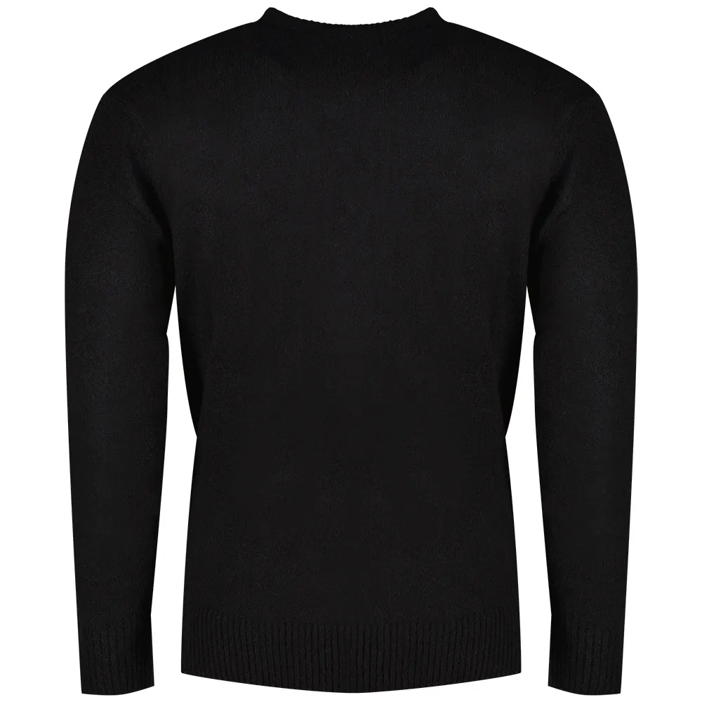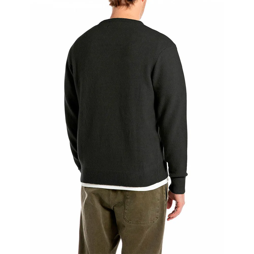 Пуловер прямого кроя с круглым вырезом из комфортного однотонного переработанного полиэстера – более экологичного материала. Эта модель с длинными рукавами и слегка спущенной линией плеч выделяется благодаря косичному вязанию по центру и тонкой резинке на горловине, манжетах и подоле. Вышитая на груди культовая буква R в тон добавляет завершающий штрих к дизайну.