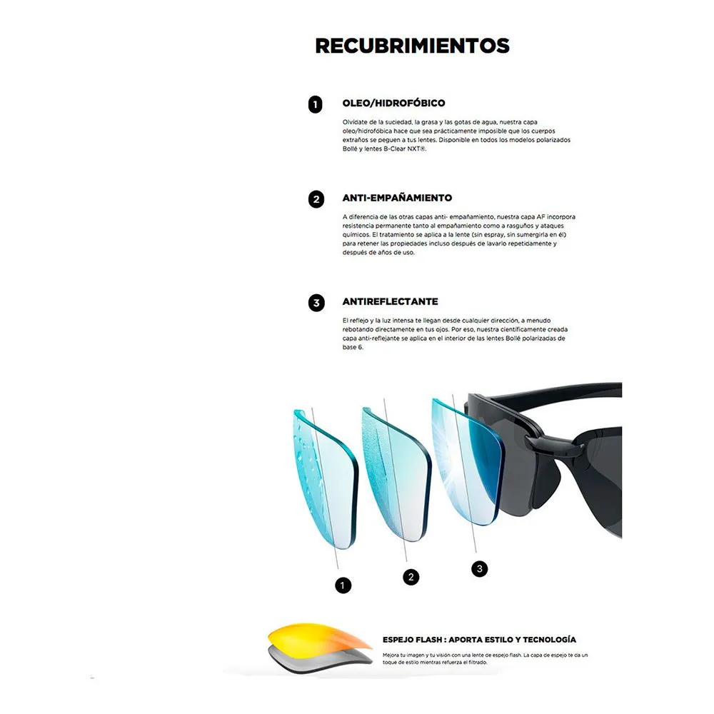 - Забудьте о грязи, жире и каплях воды — наше внешнее олео/гидрофобное покрытие практически исключает попадание инородных тел на линзы. Доступно для всех поляризованных моделей Bollé и линз B-Clear NXT.