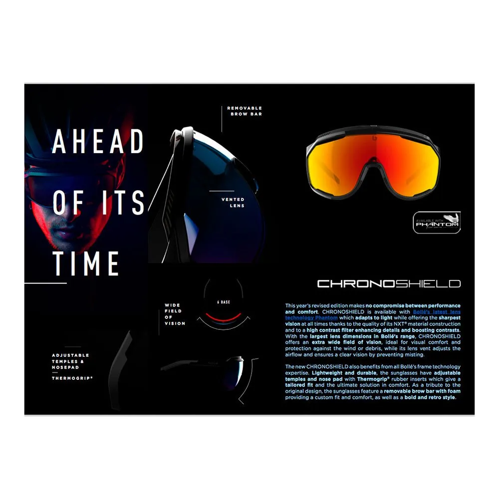 Обновлённая версия этого года не идёт ни на какие компромиссы между производительностью и комфортом. Chronoshield доступен с новейшей технологией линз Bollé Phantom, которая адаптируется к свету, обеспечивая максимально чёткое зрение в любое время благодаря качеству материала NXT и высококонтрастному фильтру, который улучшает детализацию и усиливает контрастность. Благодаря самым большим размерам линз в ассортименте Bollé, Chronoshield предлагает сверхширокое поле зрения, идеально подходящее для визуального комфорта и защиты от ветра или мусора, в то время как его вентиляционное отверстие линзы регулирует поток воздуха и обеспечивает четкое зрение, предотвращая запотевание.
