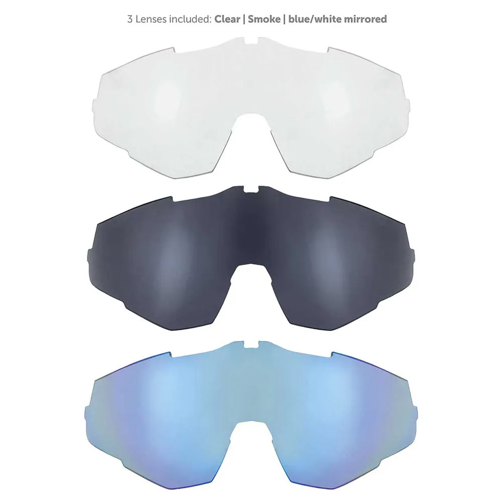 дымчатые, зеркальные BLK - RED, зеркальные BLUE - WHT и прозрачные.