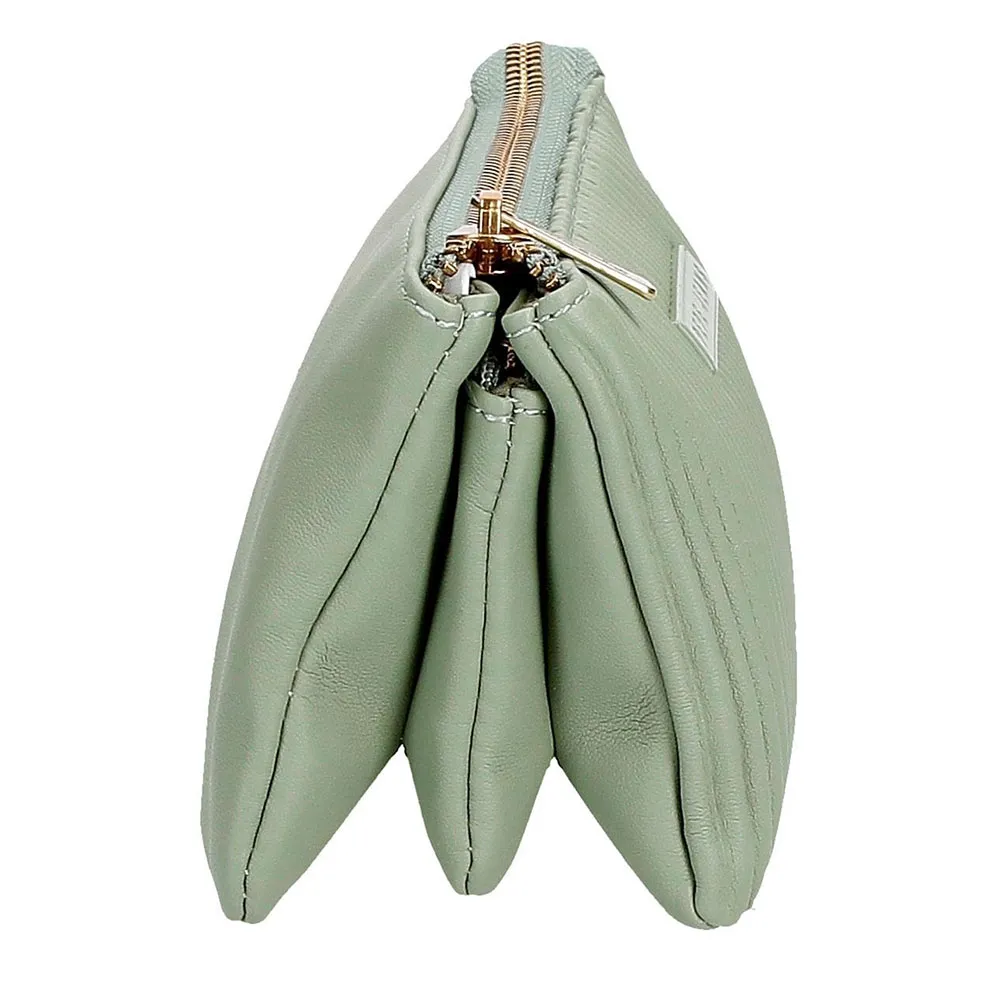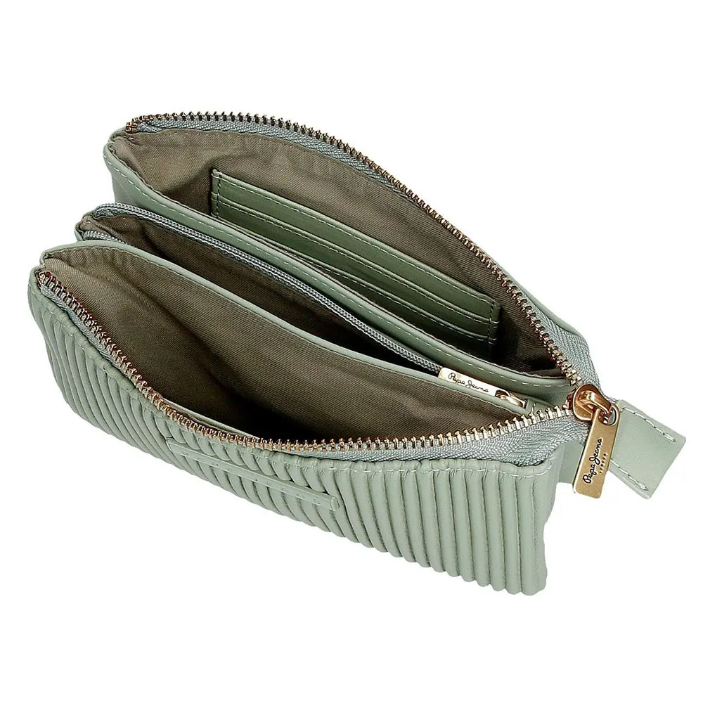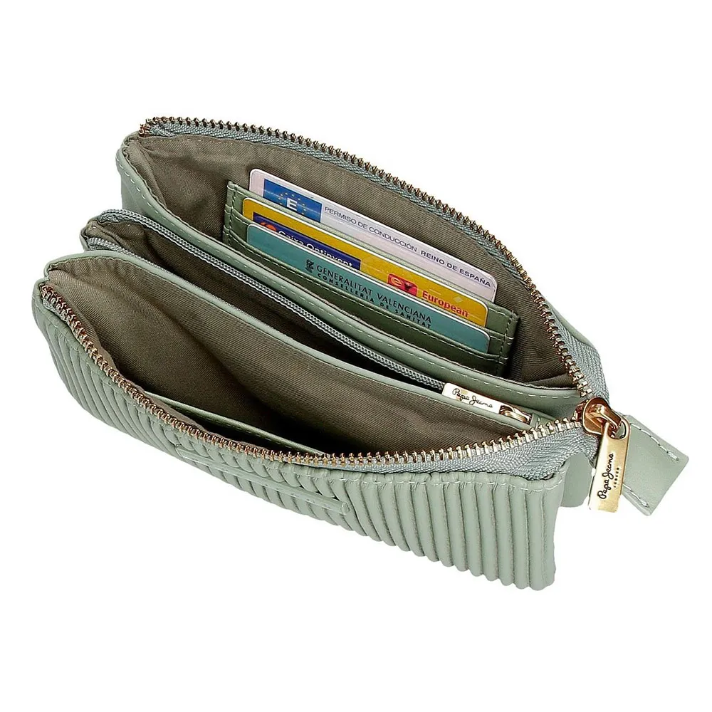 Три отделения на молнии, два из них с тремя прорезями для карт каждое и отделение на молнии посередине для монет.