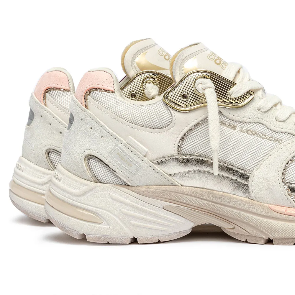 - Верх из замши и ткани цвета слоновой кости, детали из ламинированной кожи платинового цвета.