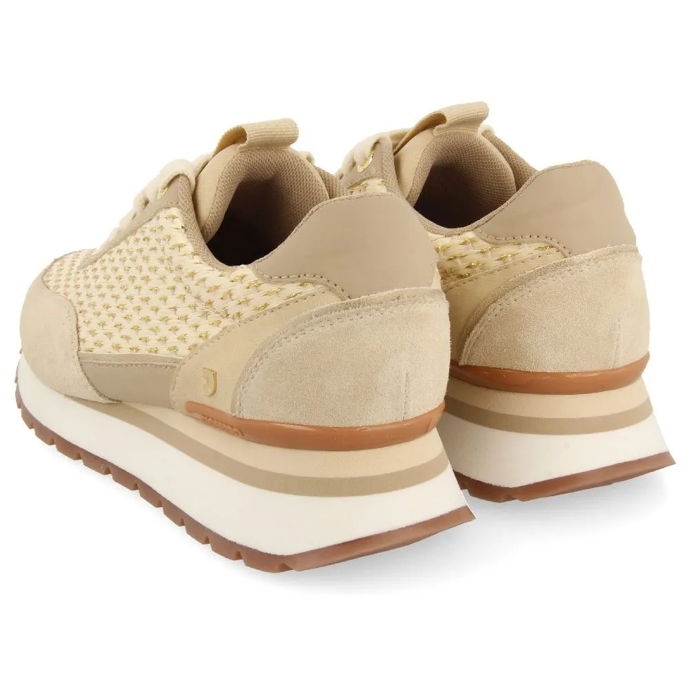 Самый средиземноморский стиль! Кроссовки базового кроя с плетением в стиле рафии бежевого цвета с телесными и золотыми вставками.