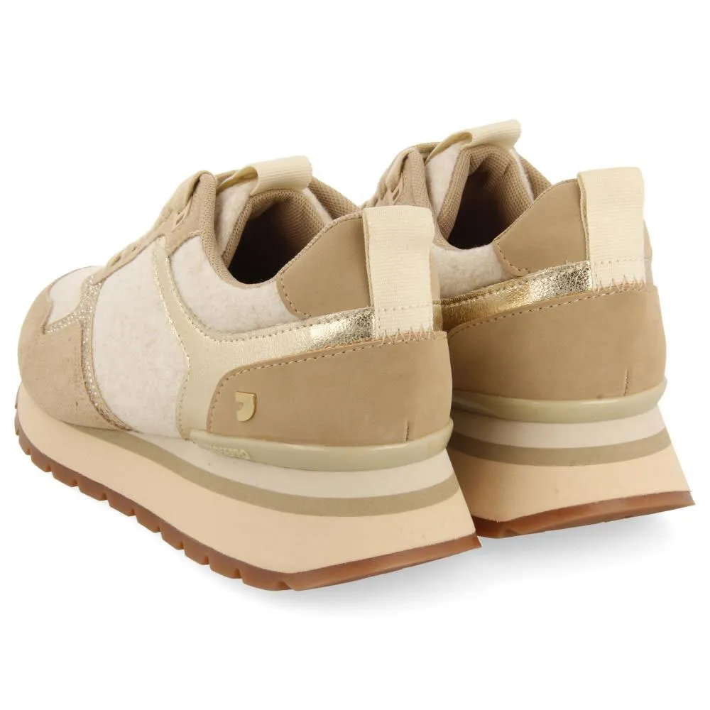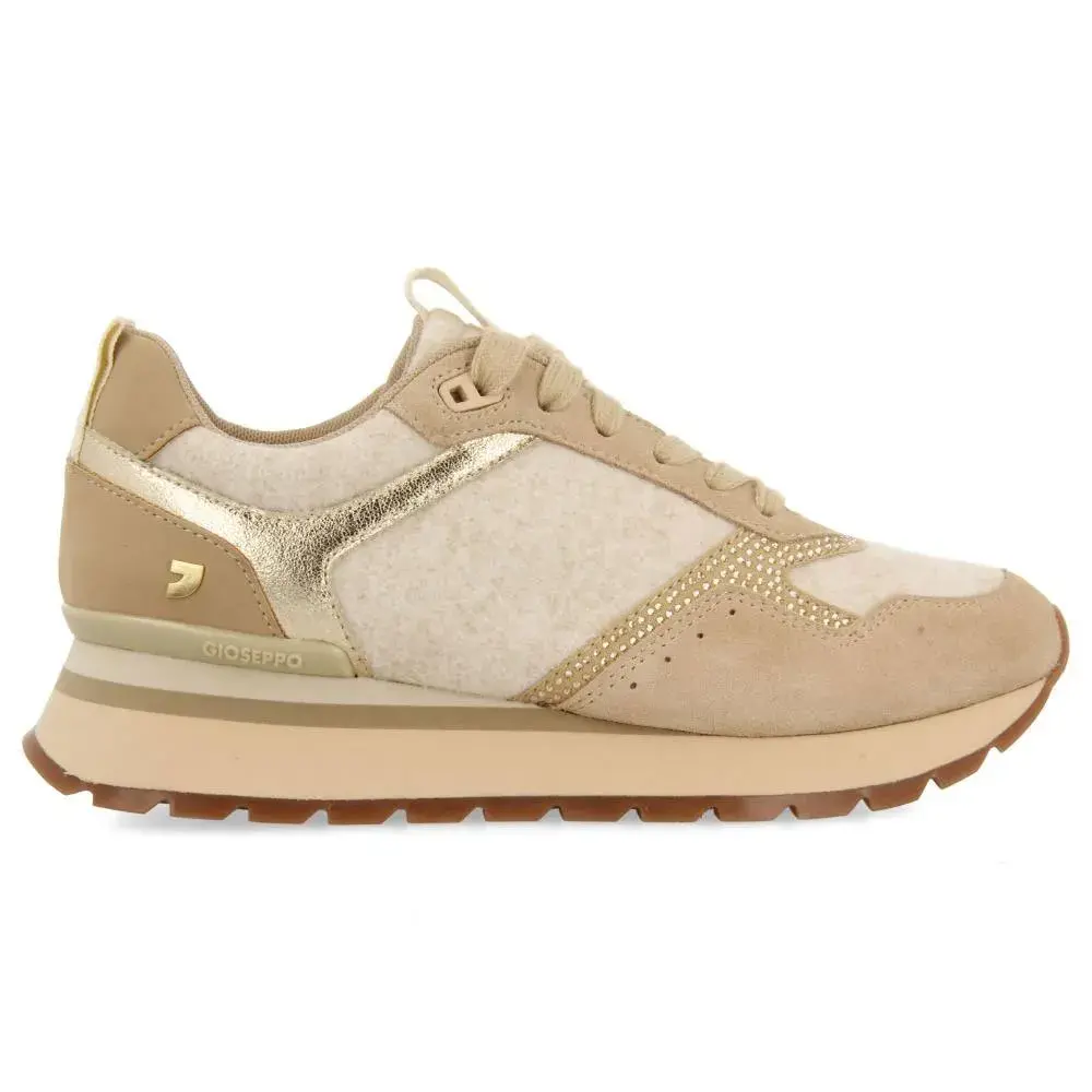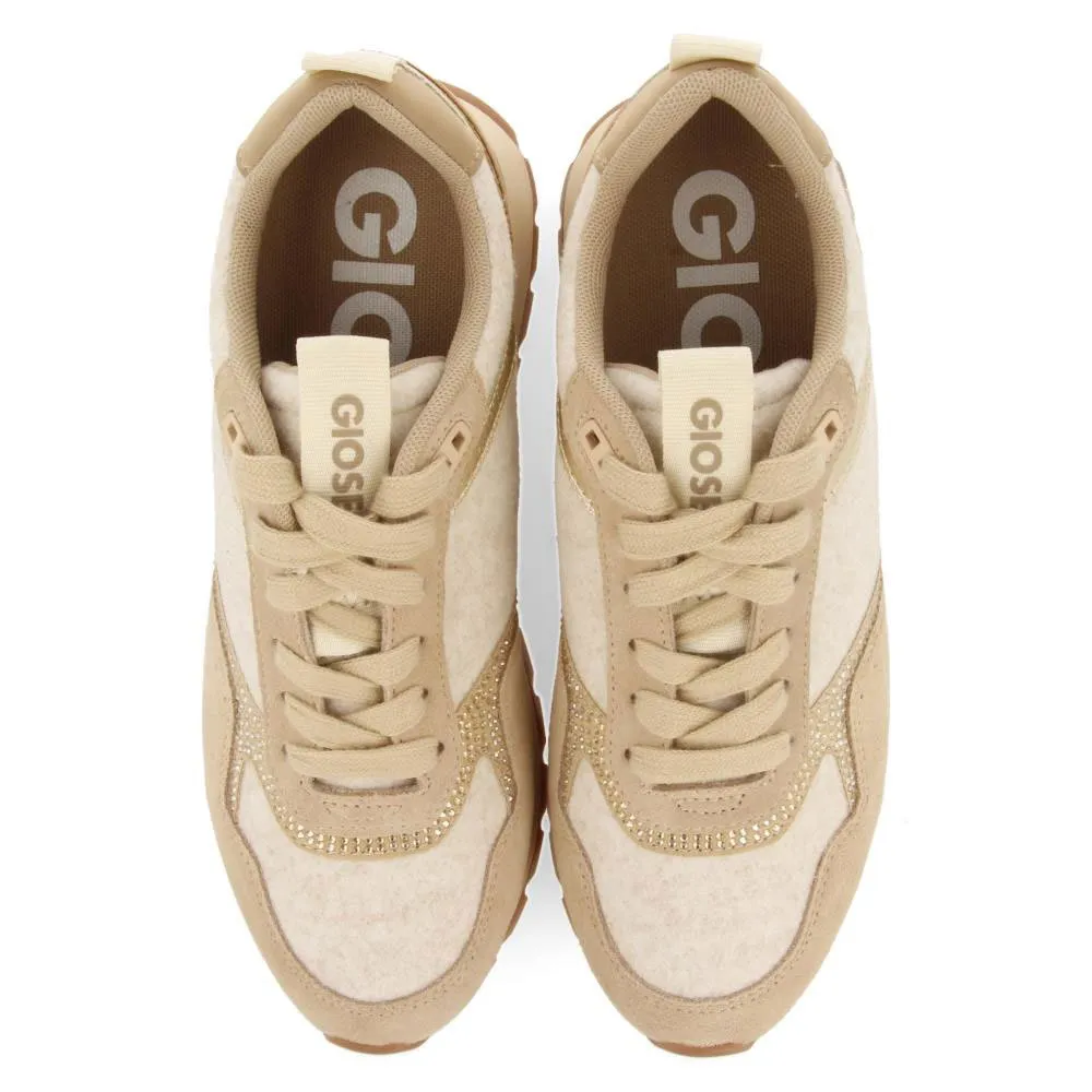 Бежевые кроссовки со стразами, металлическими акцентами и войлоком.