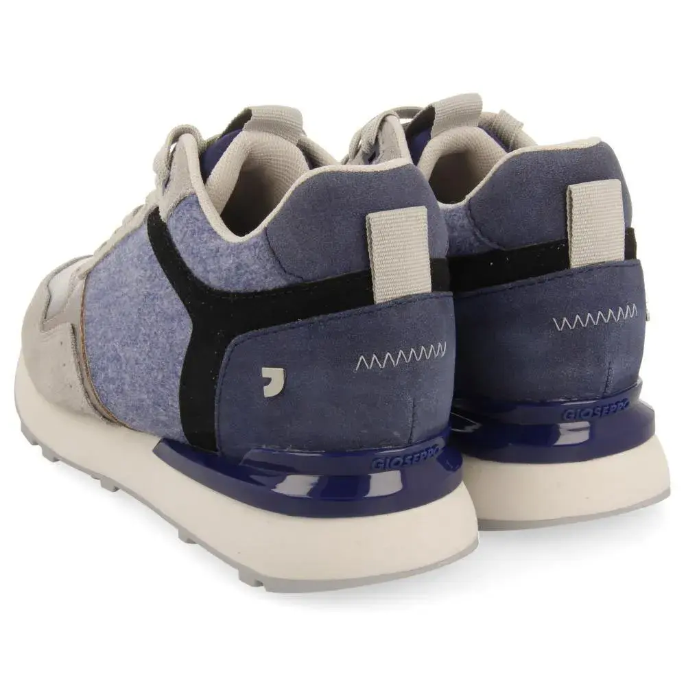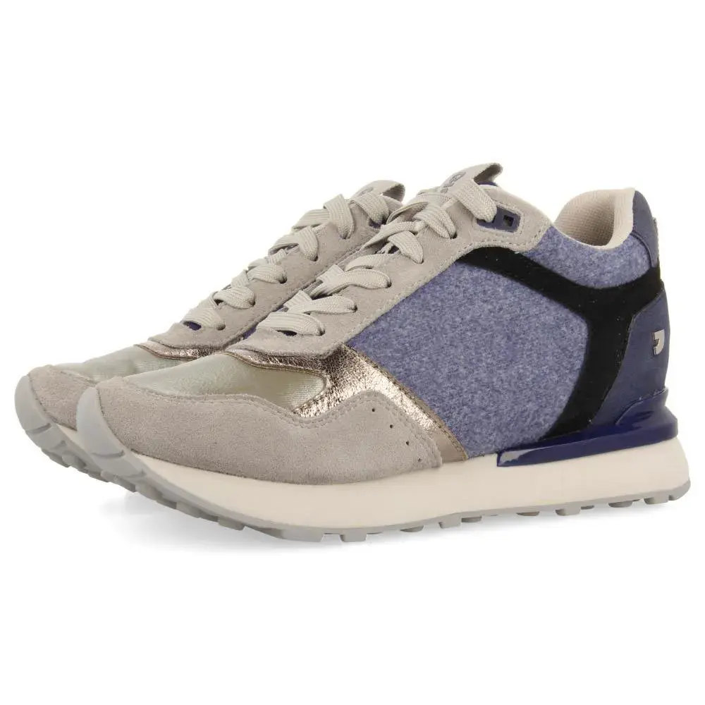 Синие кроссовки с войлоком, внутренней танкеткой и металлическими вставками.