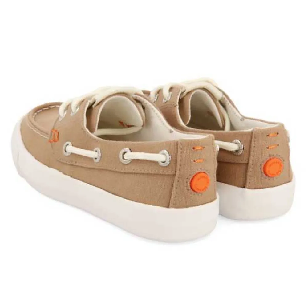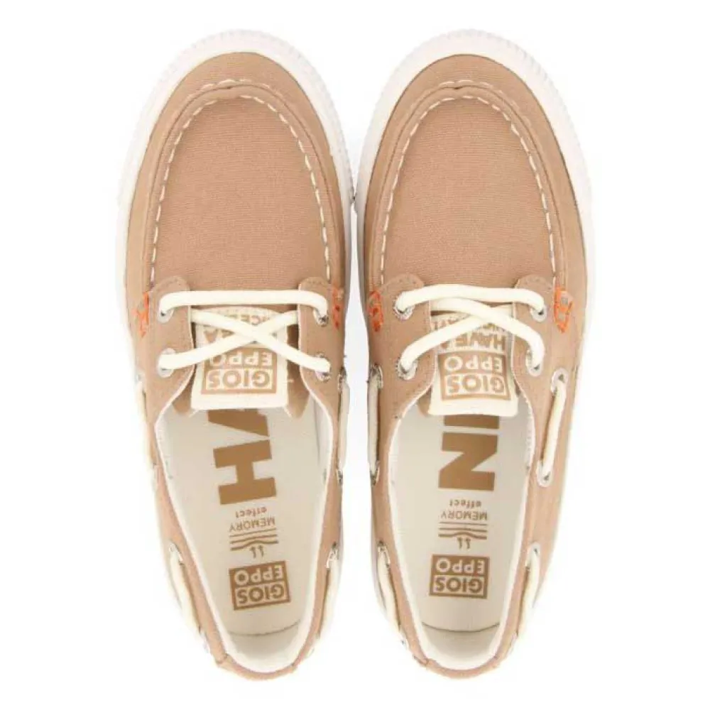 Верх выполнен из парусины, подошва — из белой резины с низом карамельного цвета.