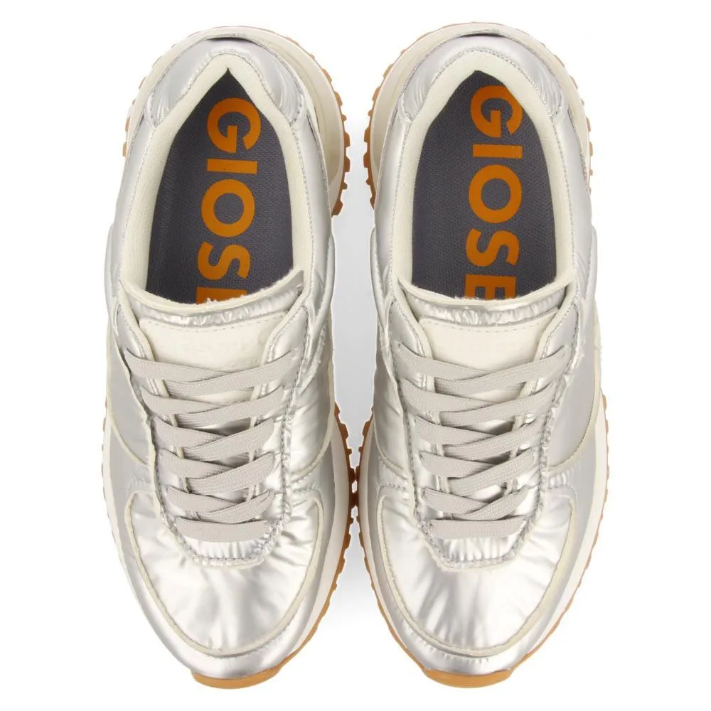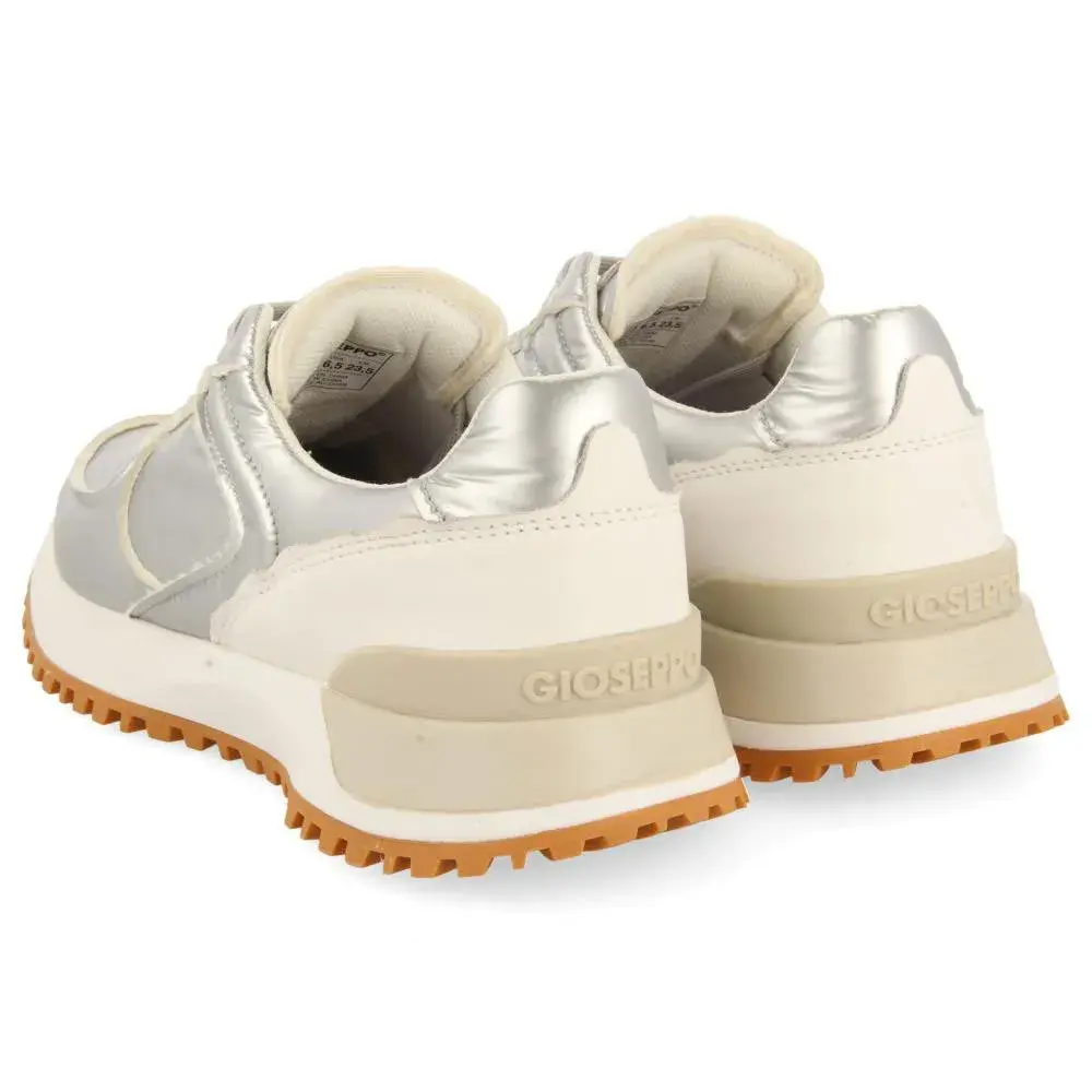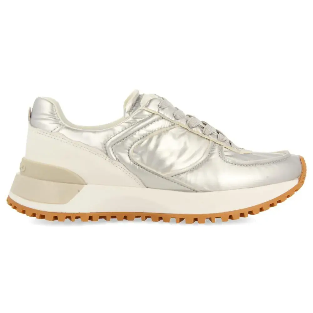 Серебристые кроссовки со съемной анатомической стелькой и литой подошвой EVA.