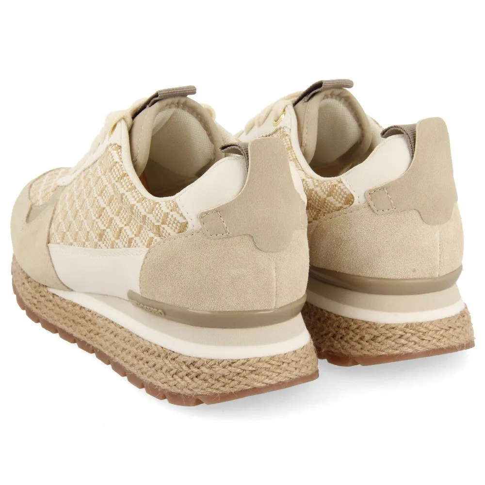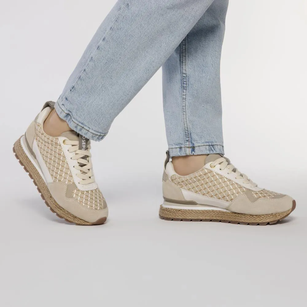 Неотразимо! Бежевые кроссовки с геометрическим рисунком, сочетающим натуральную рафию и белый цвет.