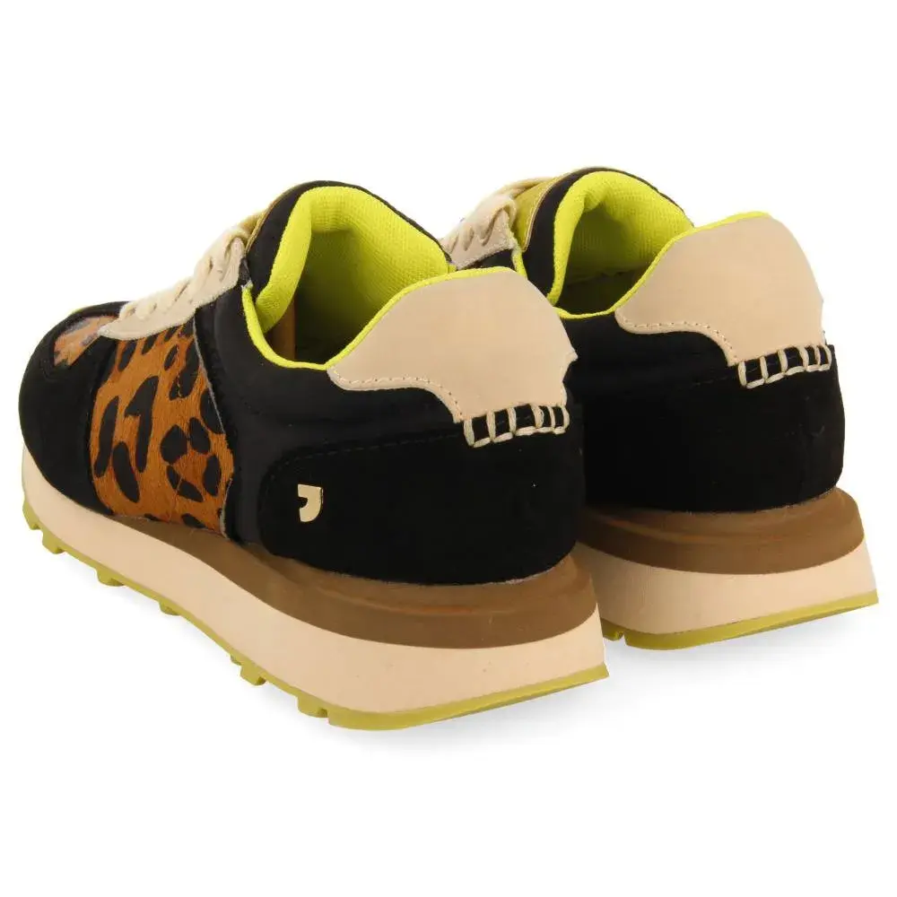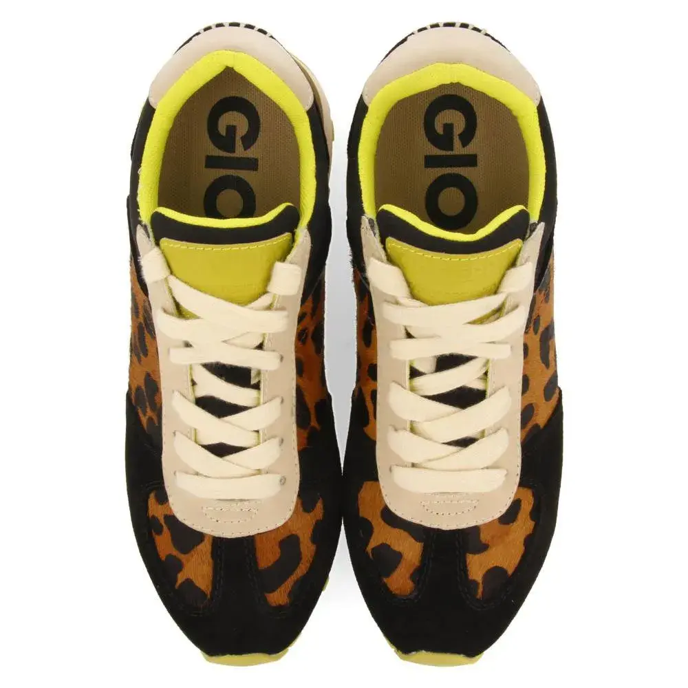 Кроссовки с леопардовым принтом и лаймовыми акцентами.