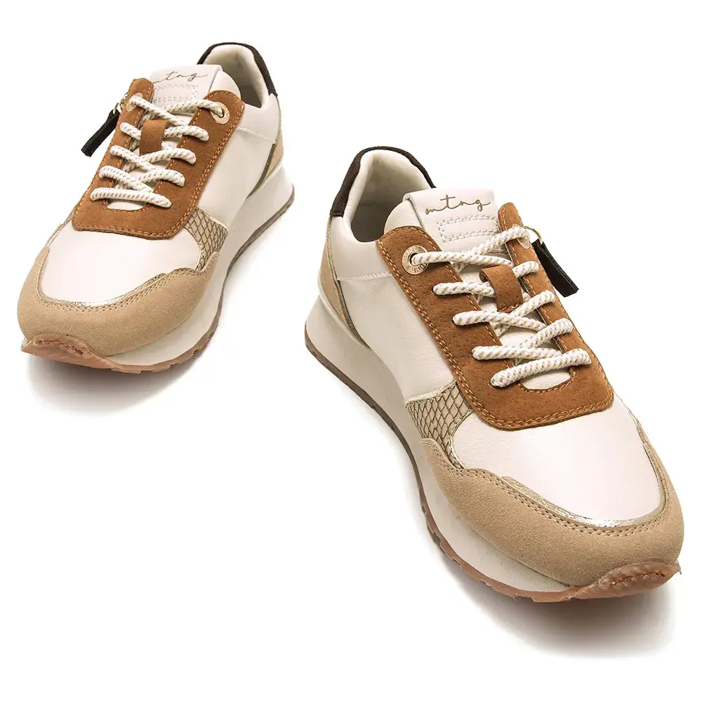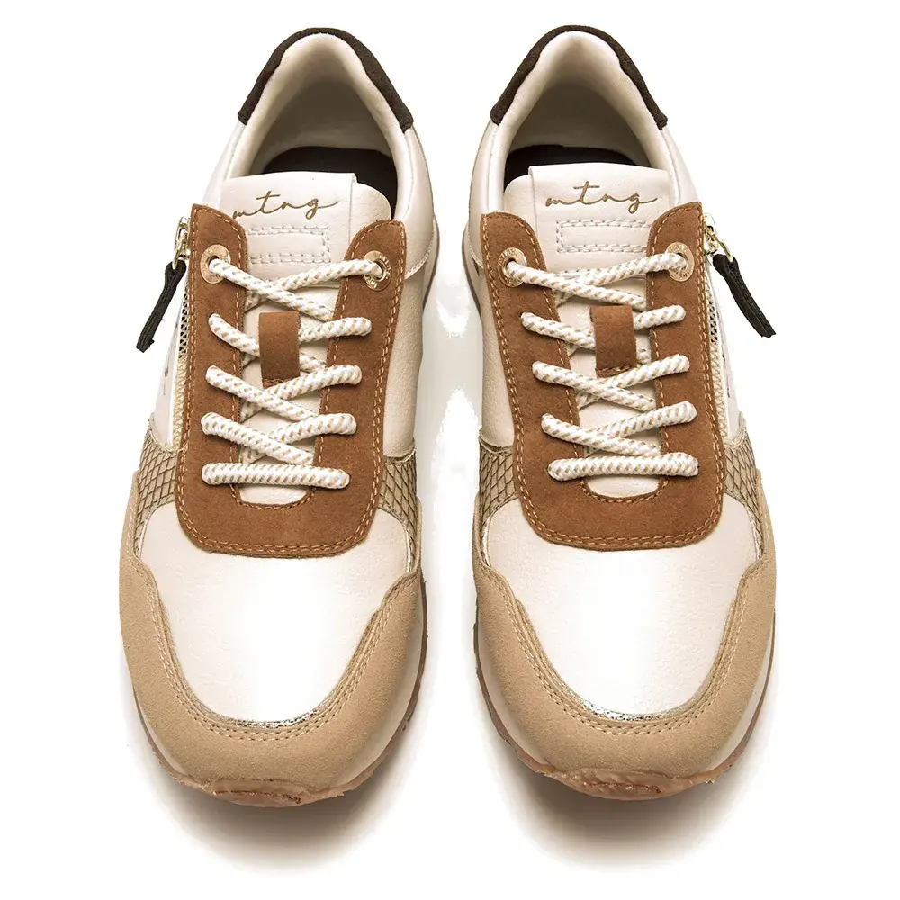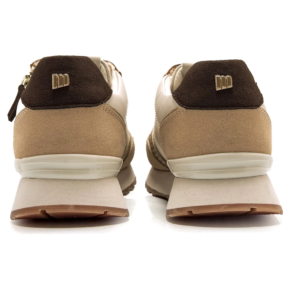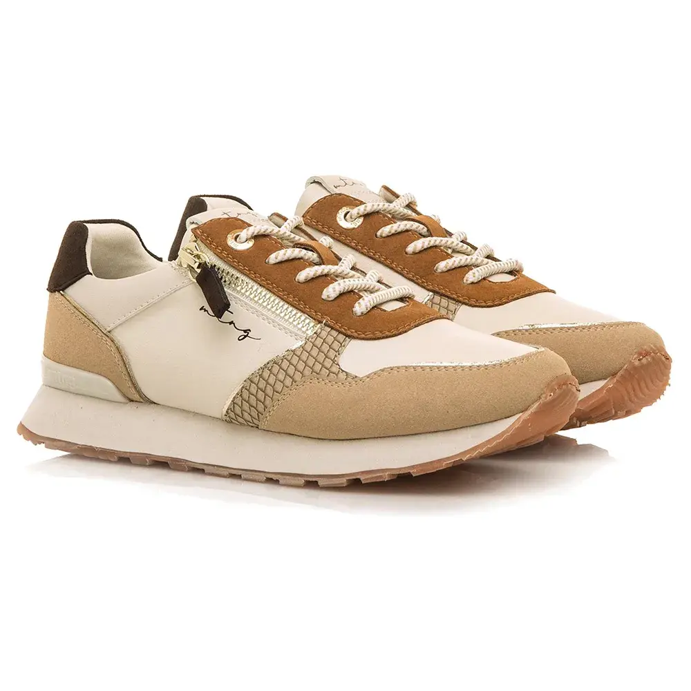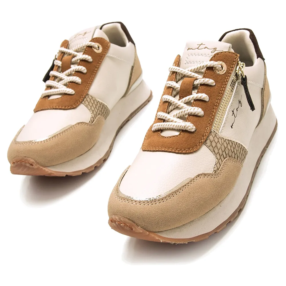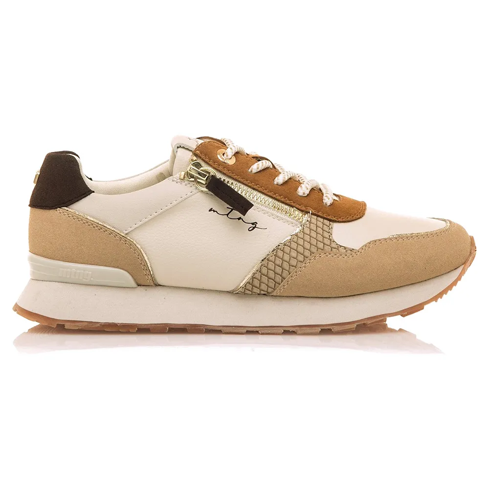 Женские кроссовки бежевого цвета с деталями в земляных тонах от бренда Mtng, модель Joggo Classic с застежкой-молнией сбоку.