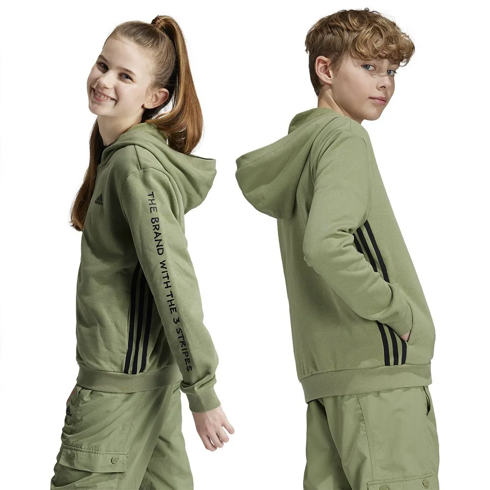 Эта стильная толстовка с капюшоном, изготовленная из 77% хлопка и 23% переработанного полиэстера, имеет боковые карманы, логотип с термопереносом на груди и тканые 3 полоски вдоль тела, гармонирующие с комфортом, стилем и уличным духом в одном изделии.