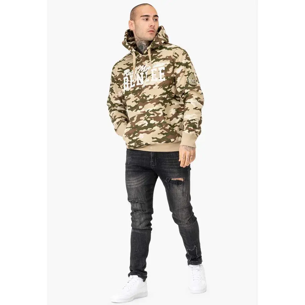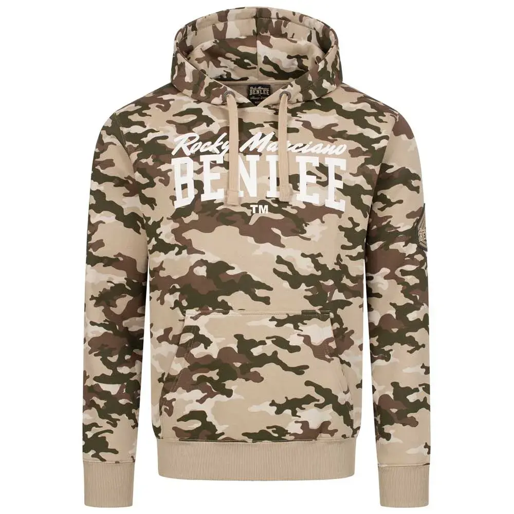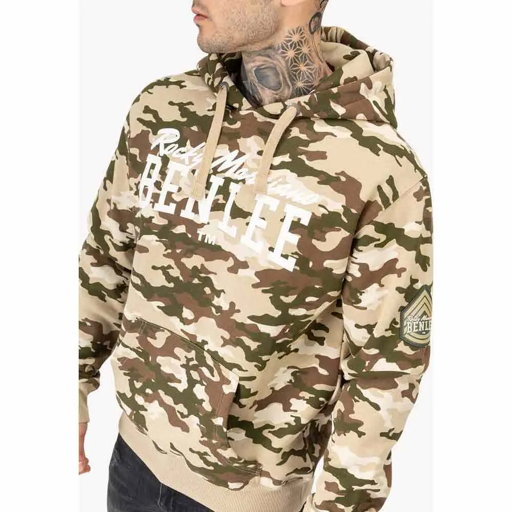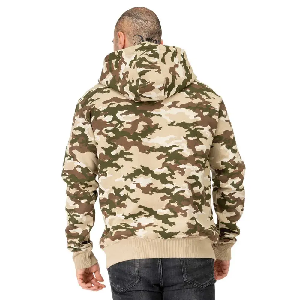 Толстовка с капюшоном в камуфляжном стиле с карманом-кенгуру и напечатанной надписью бренда на груди. На левом рукаве – резиновый 3D-нашивка. Кулиска на капюшоне и ребристые манжеты контрастного цвета.