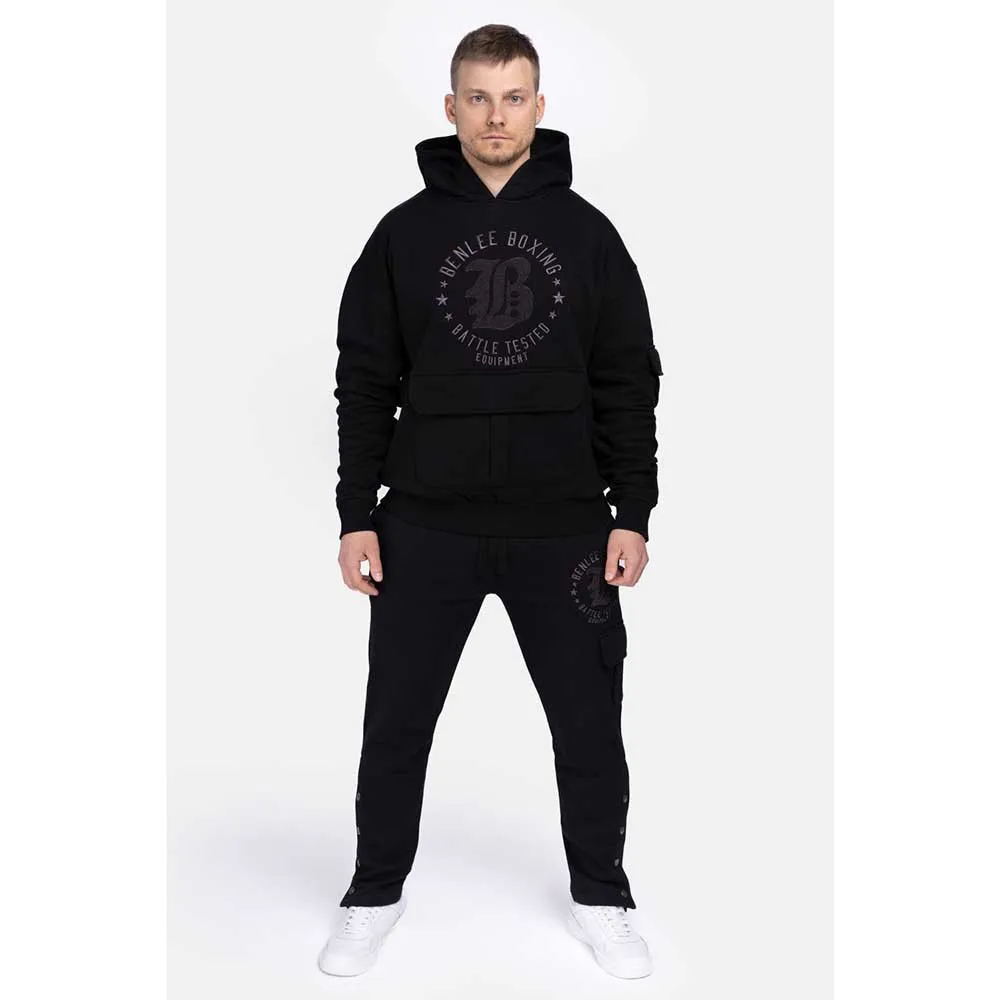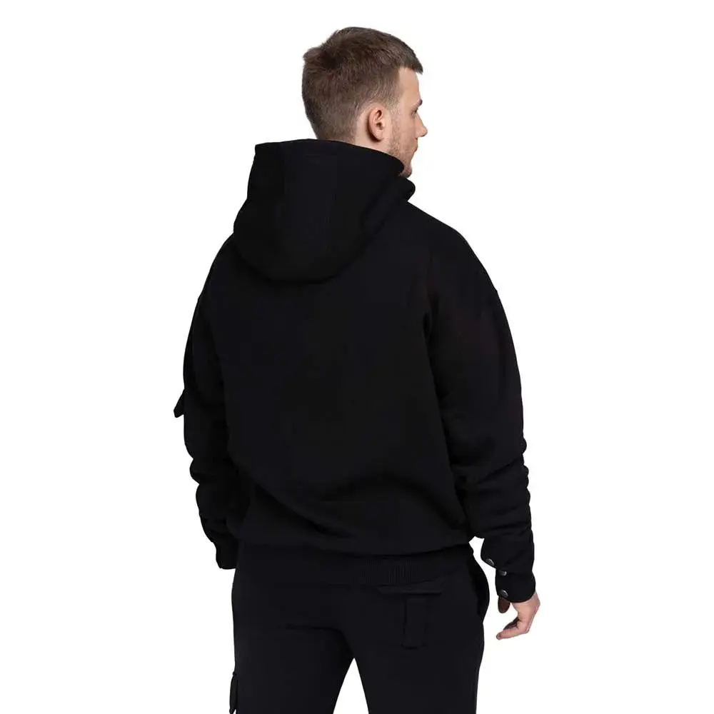Свитшот свободного кроя с крупным вышитым логотипом на груди (обычная вышивка и махровая вышивка). Спереди и на левом рукаве накладные карманы, которые можно открыть и закрыть на липучке. На манжетах рукавов планка с кнопками.