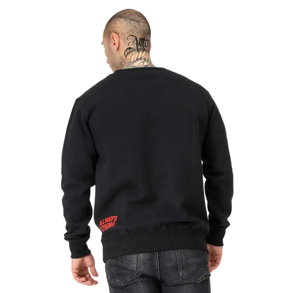 Толстовка с круглым вырезом, большим логотипом на груди и небольшим фирменным принтом на нижней части спины слева.
