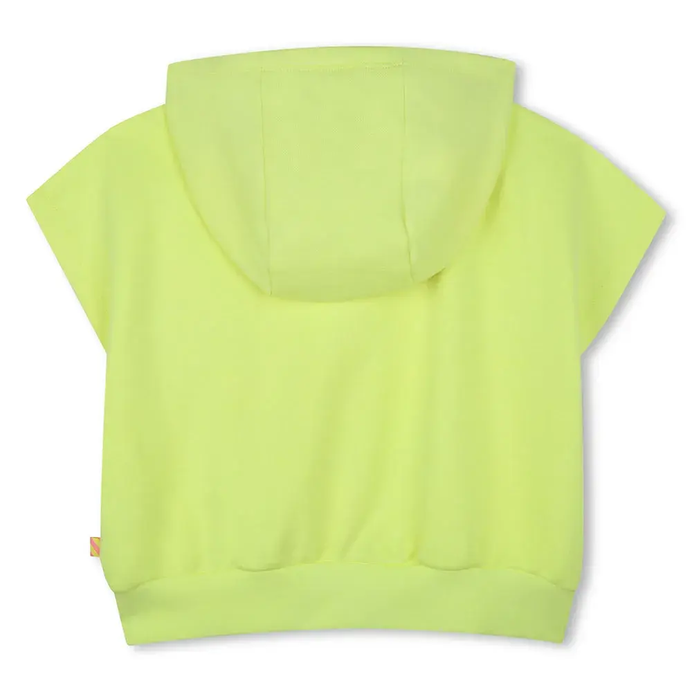 Свитер из французского трикотажа, пигментная окраска, короткие рукава, капюшон, резинка по низу, декоративный рисунок спереди, этикетка.