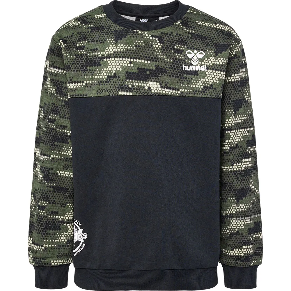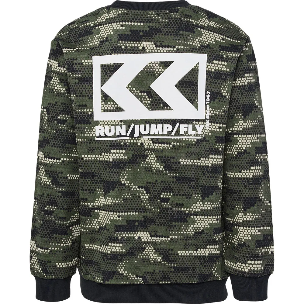 Классический дизайн толстовки с логотипами Flying Superkids и Hummel спереди, а также культовыми шевронами и надписью «RUN/JUMP/FLY» на спине.