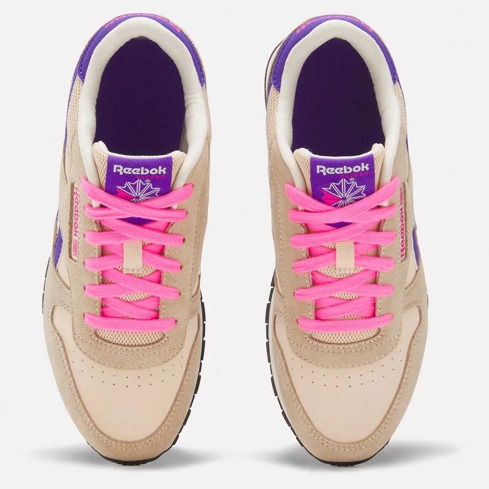 Кроссовки REEBOK Classic Leather в цветах тапиока / атомно-розовый / солнечно-фиолетовый — стильный и модный вариант для детей. Эти кроссовки имеют классический кожаный верх цвета тапиока с яркими акцентами атомно-розового и солнечно-фиолетового цветов, которые добавляют кроссовкам яркости. Культовый логотип REEBOK сбоку обеспечивает узнаваемость бренда. Эти кроссовки разработаны для комфорта и эффективности благодаря амортизирующей промежуточной подошве и прочной резиновой подошве, обеспечивающей сцепление и поддержку в течение всего дня. Эти детские кроссовки REEBOK Classic Leather, будь то для повседневных прогулок или активных игр, обязательно понравятся любой юной моднице.