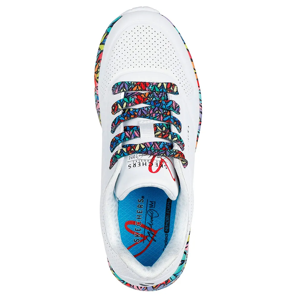 Всемирно известный художник-монументалист Джеймс Голдкраун представляет свои культовые сердечки Lovewall в рамках этой вдохновляющей коллаборации с Skechers. Продемонстрируйте свой творческий стиль с помощью коллекции Skechers Street x JGoldcrown Uno Lite Subtle Love. Эти модные кроссовки на шнуровке украшены принтом фирменного дизайна сердца художника на промежуточной подошве, синтетическим дюрабаком и перфорированным верхом со стелькой из пены с эффектом памяти Skechers Air-Cooled.