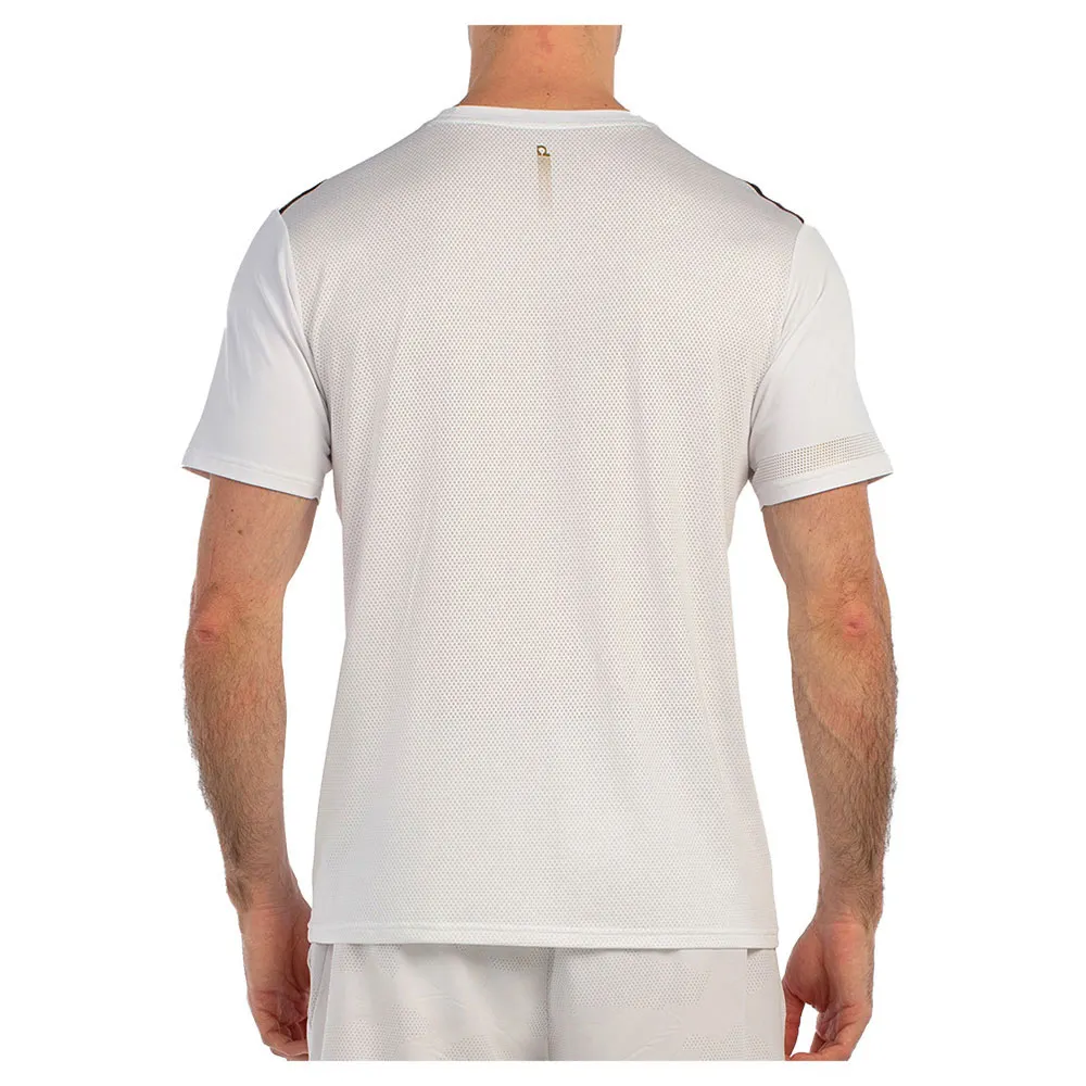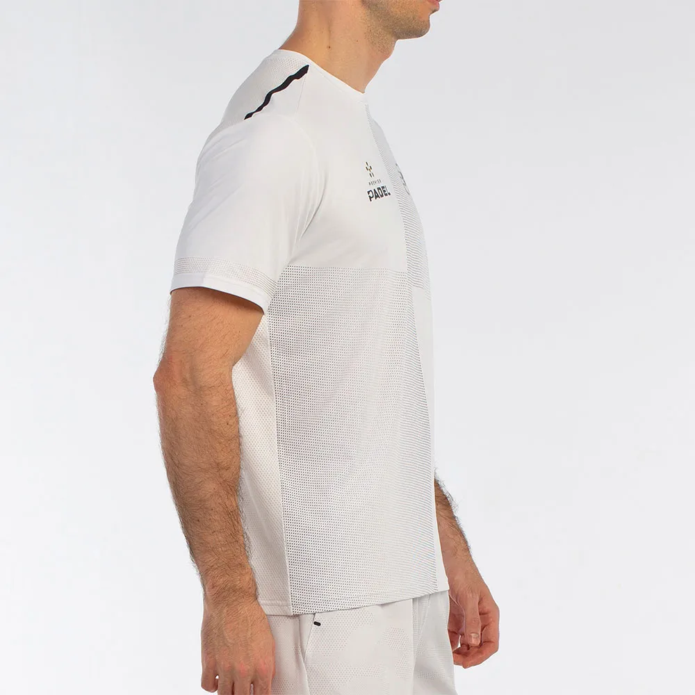 Футболка из эластичного полиэстерового трикотажа. Сетчатая ткань на спине для лучшей вентиляции. Применена технология Drynamic с использованием микроволокон для отвода влаги и стимулирования потоотделения. Модель выполнена с сублимационной печатью, а термосварные швы на плечах отделаны ультразвуковой тесьмой. Украшена графикой Premier Padel.