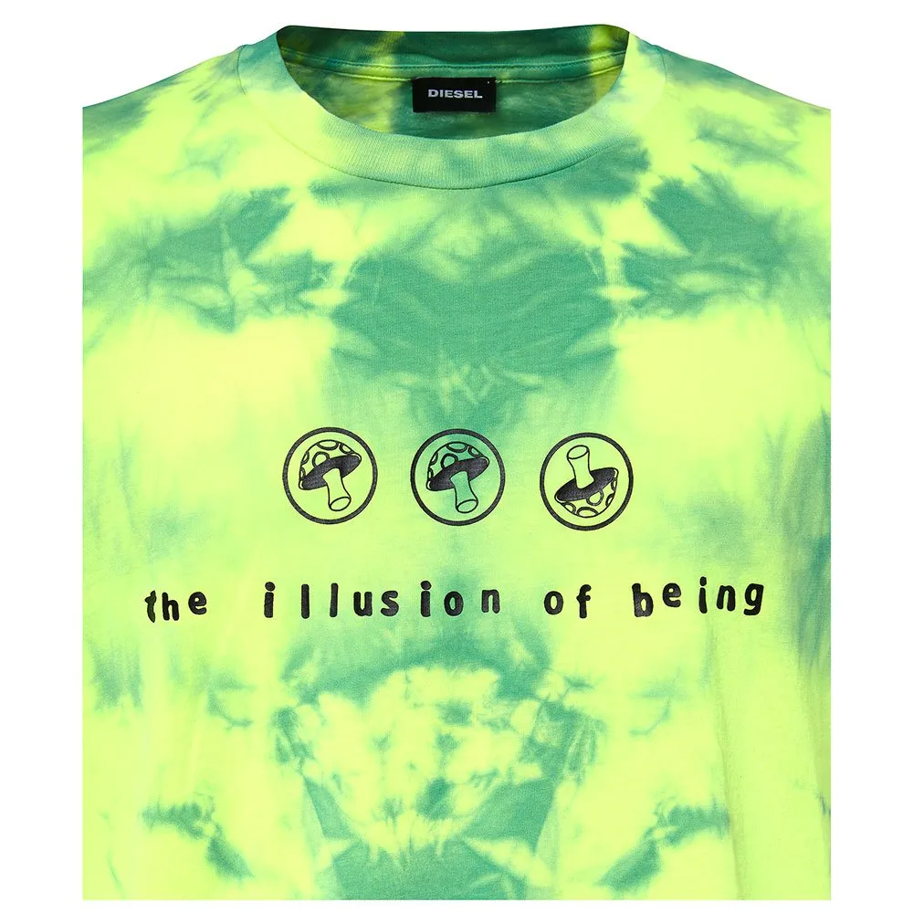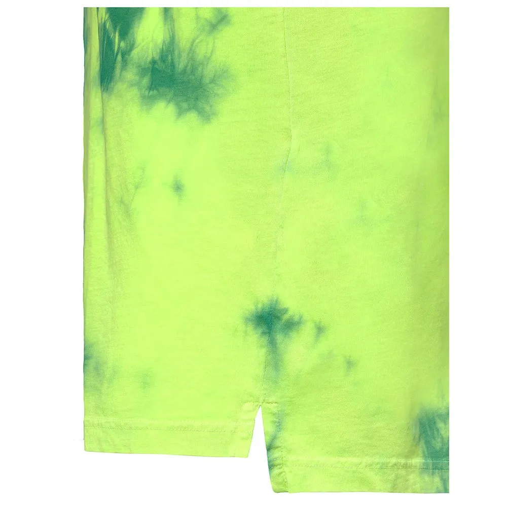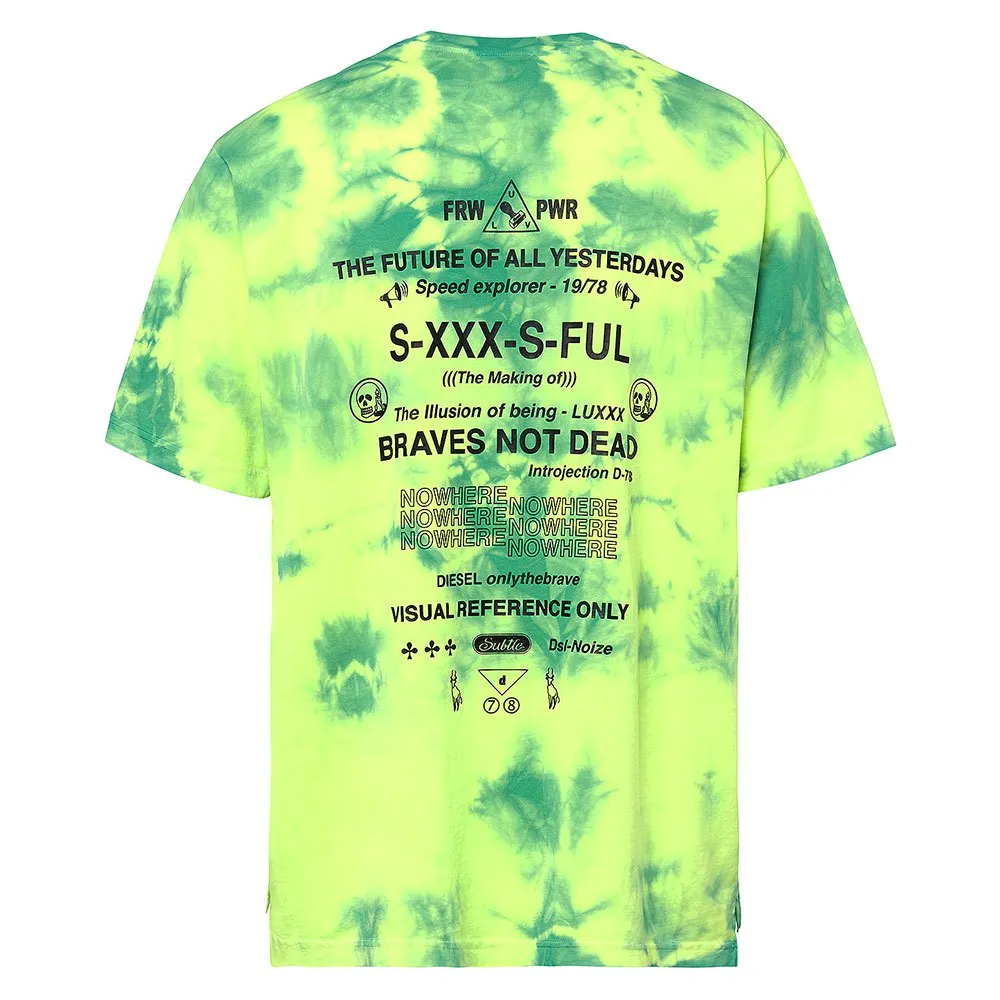 Изделие окрашено в технике тай-дай и дополнено контрастными прорезиненными принтами, вдохновленными клубной и рейв-культурой.