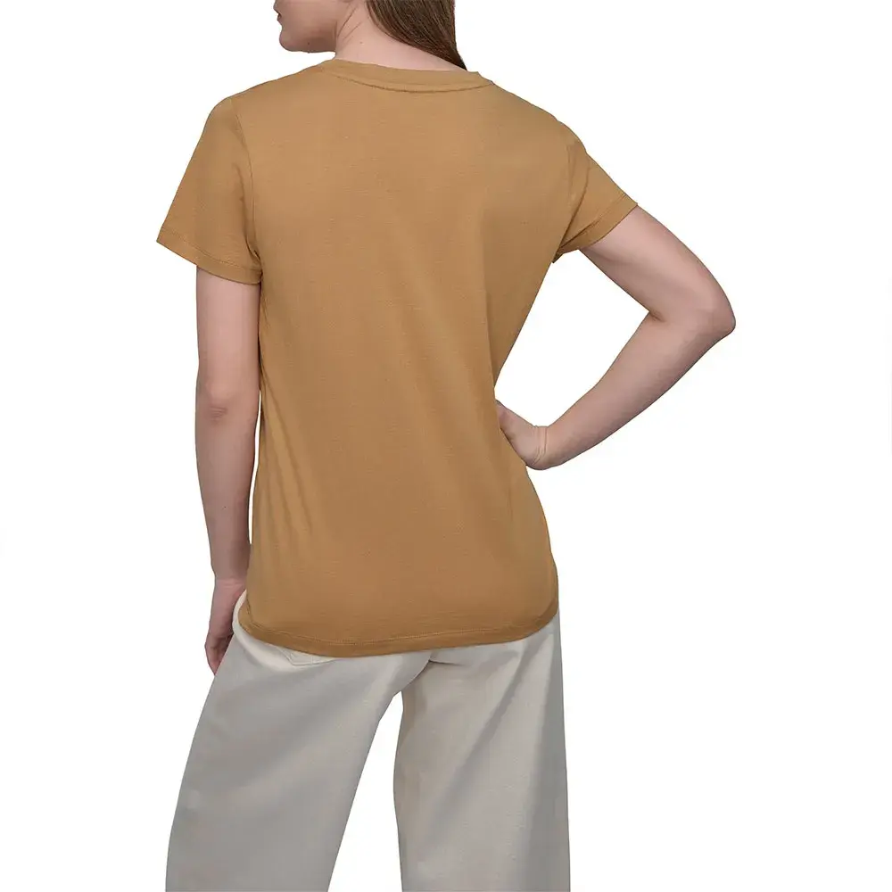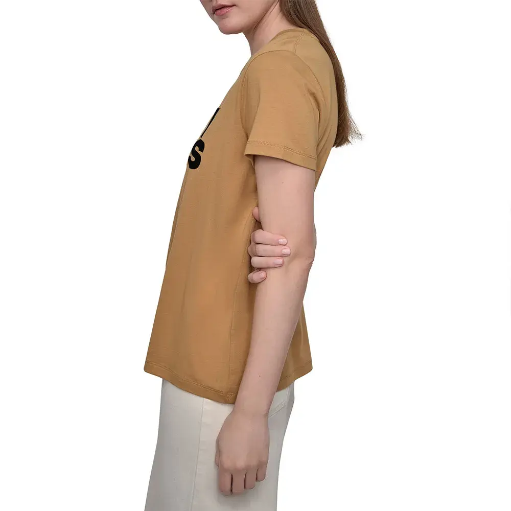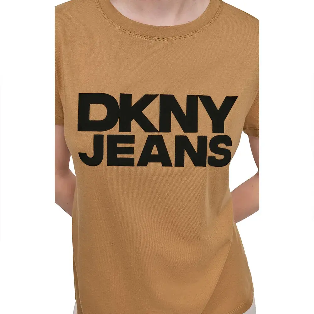 Простая футболка с короткими рукавами и круглым вырезом. На груди — фирменный логотип джинсов DKNY.