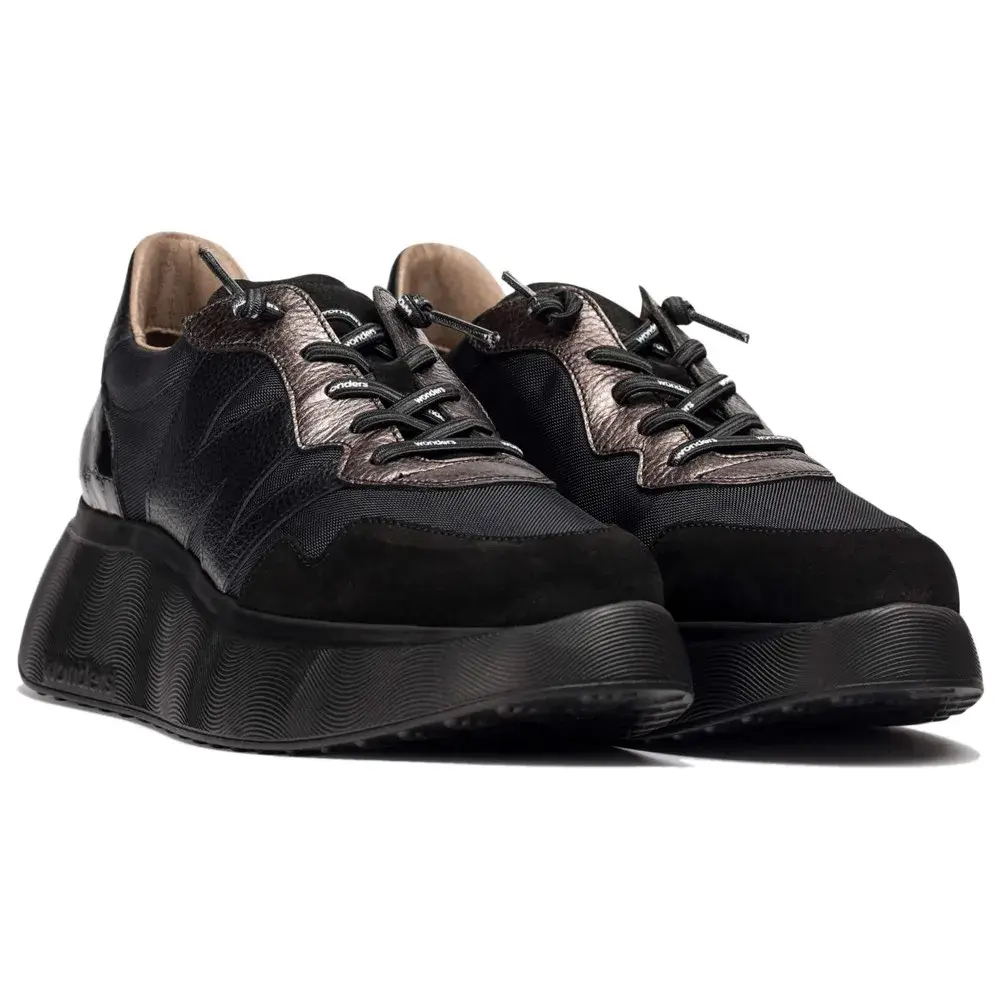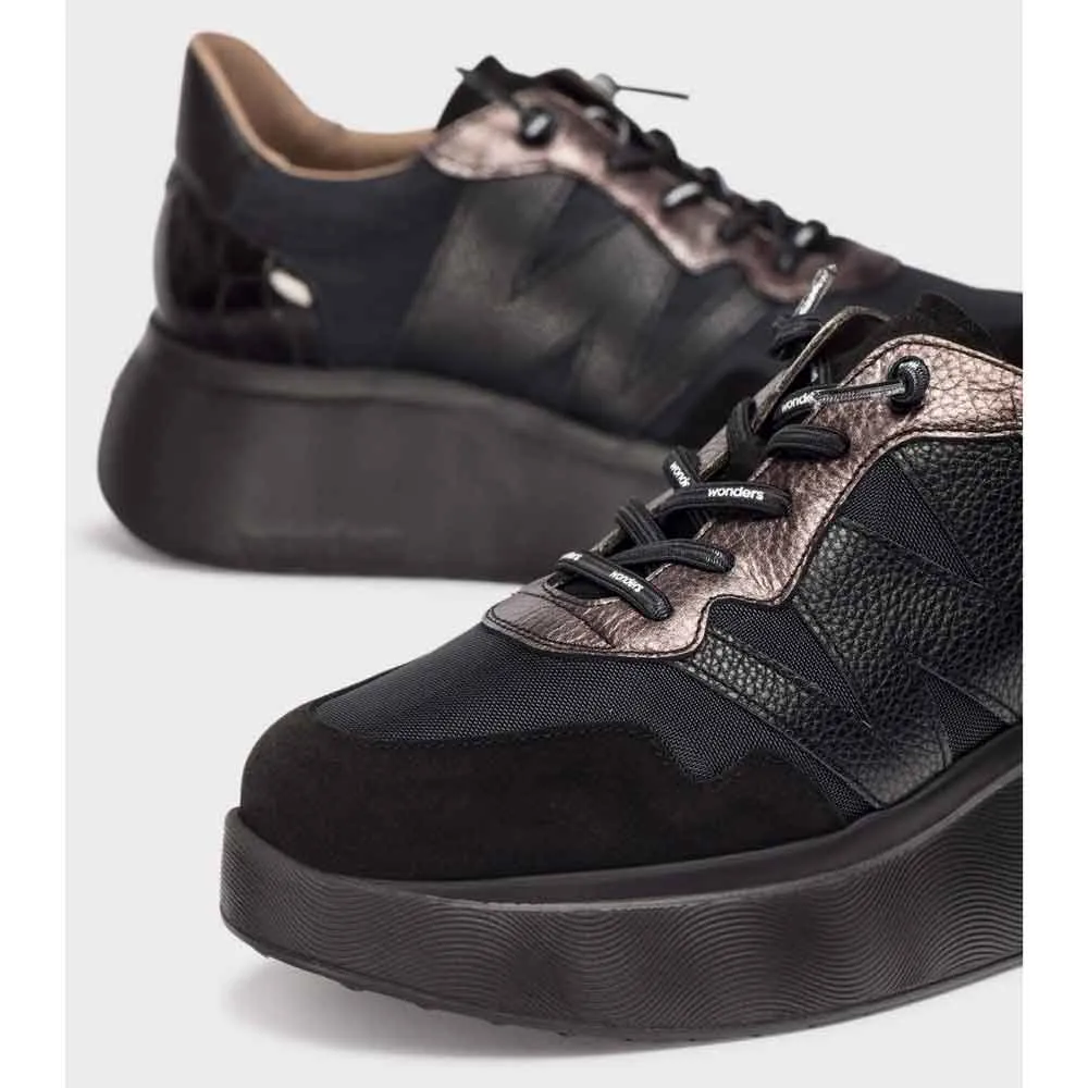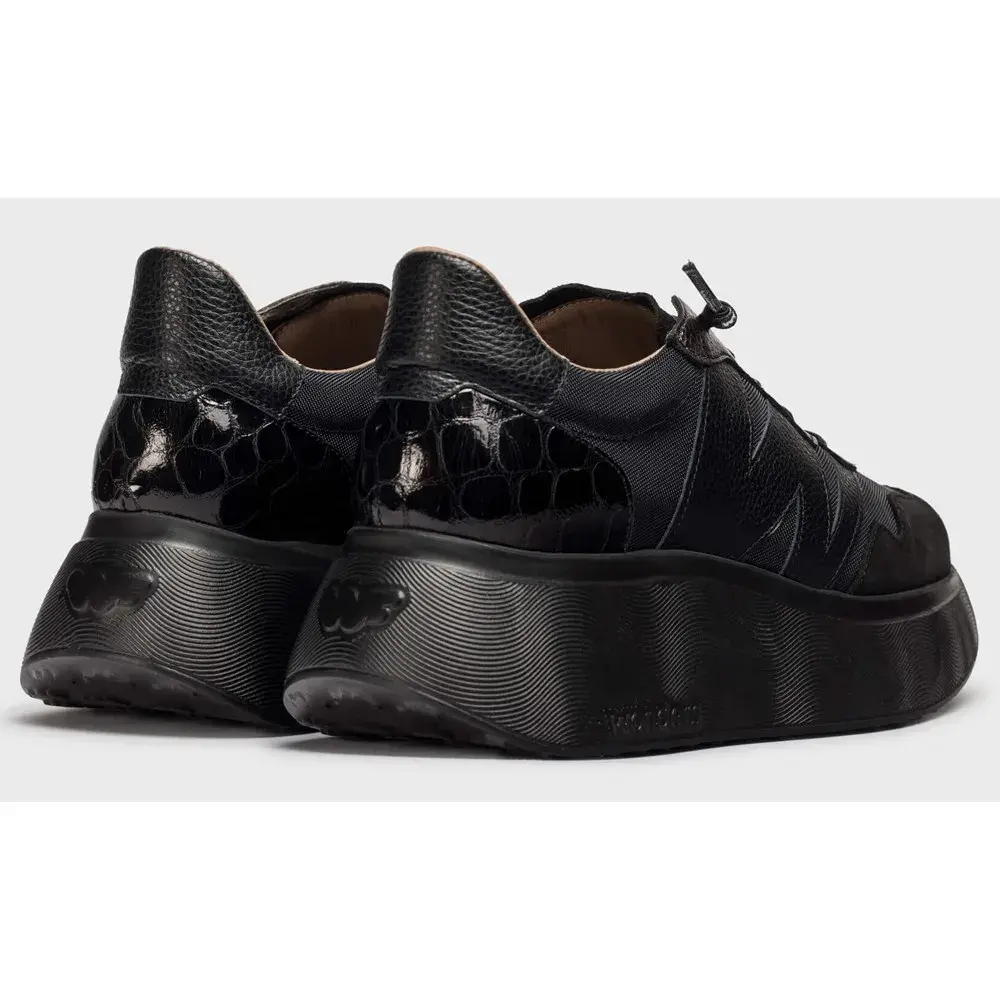 Черные кроссовки на платформе с подошвой высотой около 5 см, выполненные из кожи и текстиля.