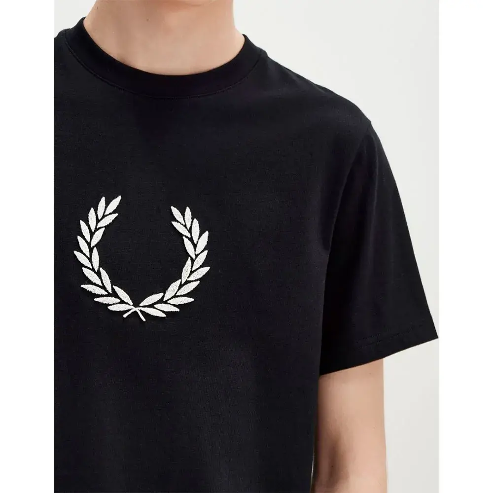 Ощутите роскошные ощущения от мягкого, дышащего хлопка на коже. Классический круглый вырез обеспечивает комфортную посадку и подчеркивает фигуру, а короткие рукава идеально подходят для теплой погоды или в качестве накидки под лёгкую куртку. Фирменный лавровый венок FRED PERRY, символ наследия и спортивного совершенства, украшен тонким тиснением с текстурированной отделкой, добавляя нотку сдержанной элегантности, которая отличает эту футболку от обычной.