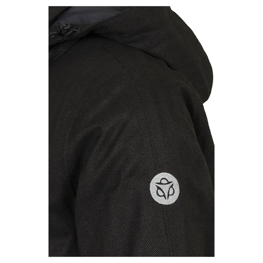 Внешняя часть пальто изготовлена из высококачественной, 100% переработанной полиэстеровой ткани с рисунком «елочка», похожим на шерсть.