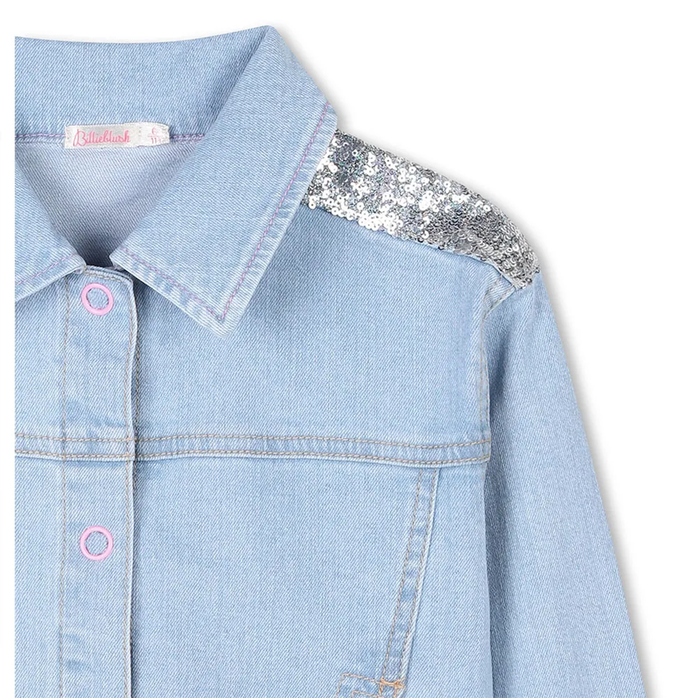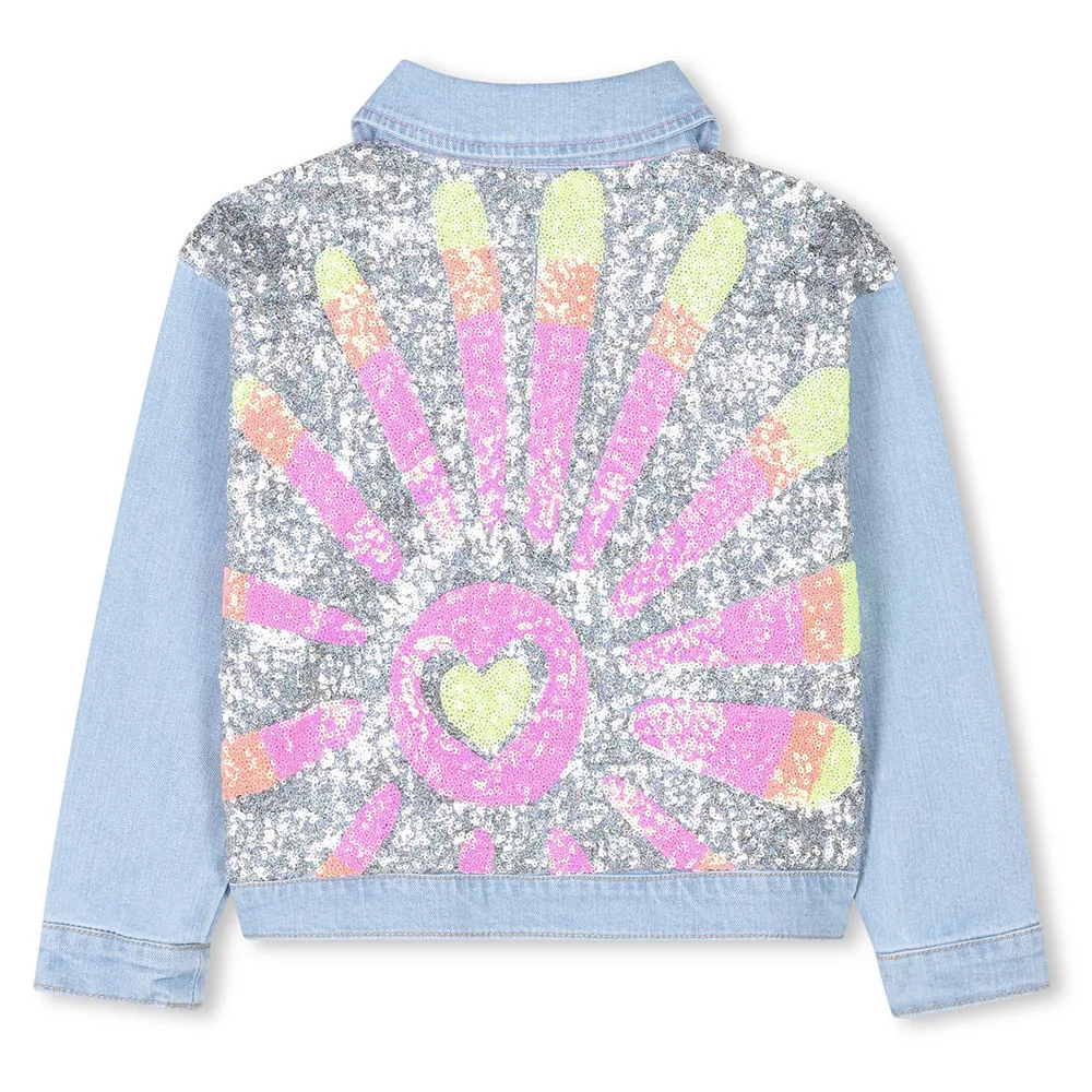 Джинсовая куртка, рубашечный воротник, 2 кармана, застежка на кнопку, декоративный рисунок из пайеток сзади, этикетка.