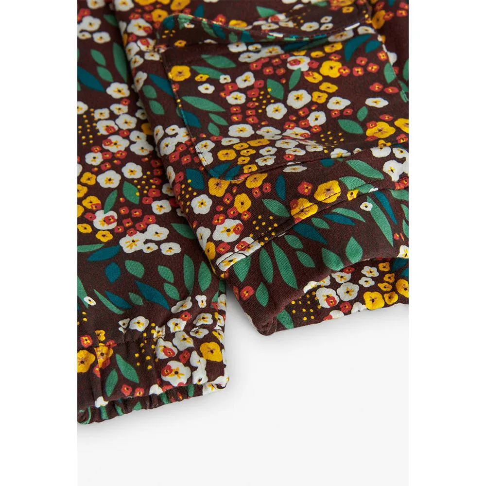 Очаровательный разноцветный цветочный принт на коричневом фоне добавит уникальный и жизнерадостный штрих в детский гардероб.