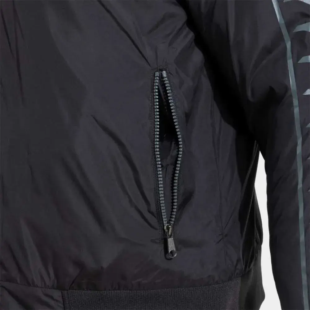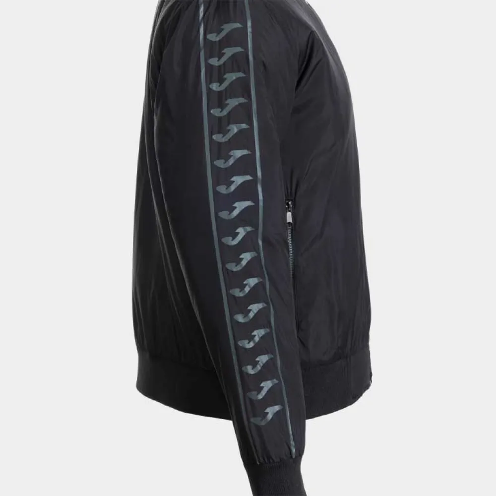 Мужская куртка-бомбер на молнии по всей длине, сочетающая в себе современный стиль и функциональность, идеально подходит для различных случаев, от повседневных прогулок до лёгких тренировок. Принты на рукавах добавляют ей выразительный и актуальный штрих.