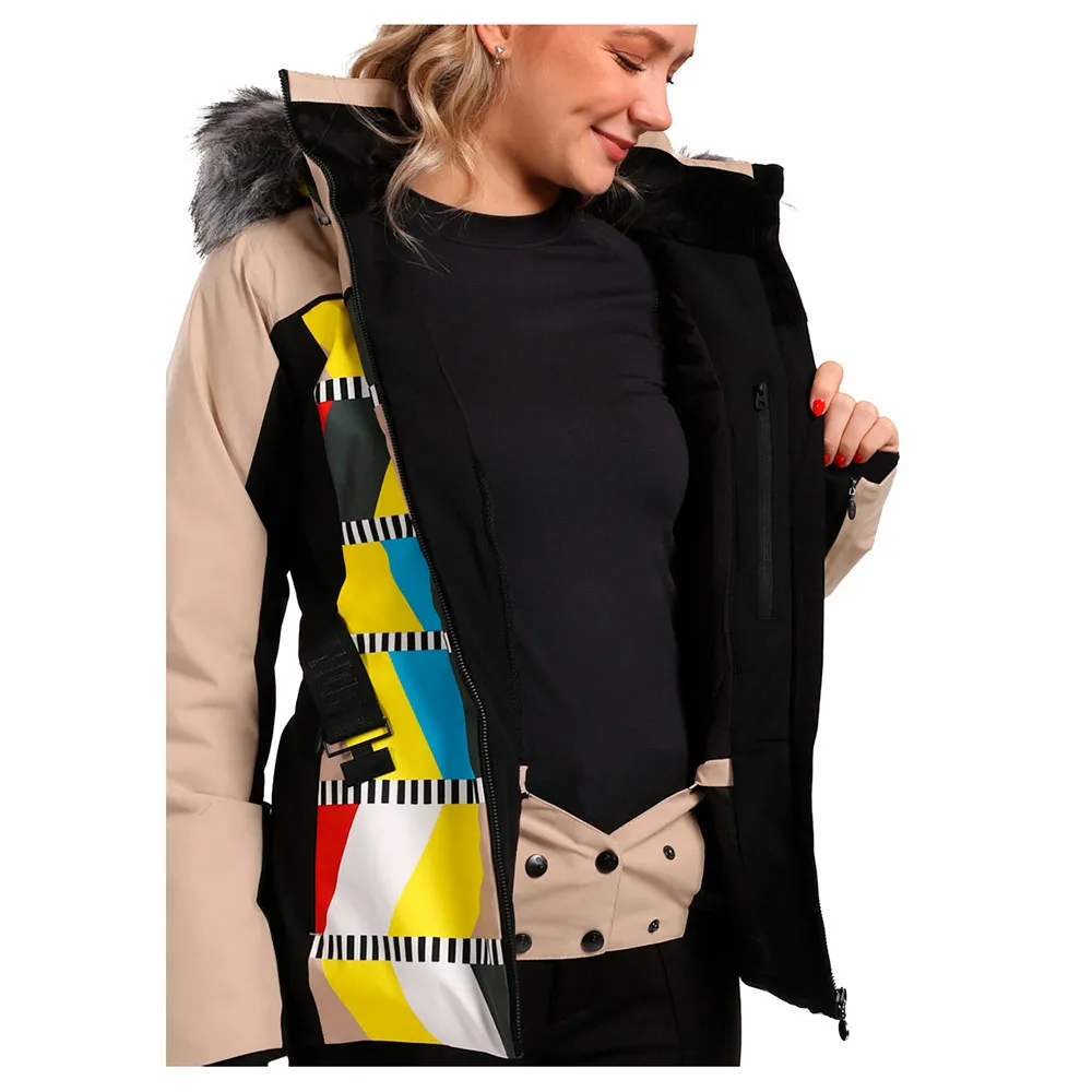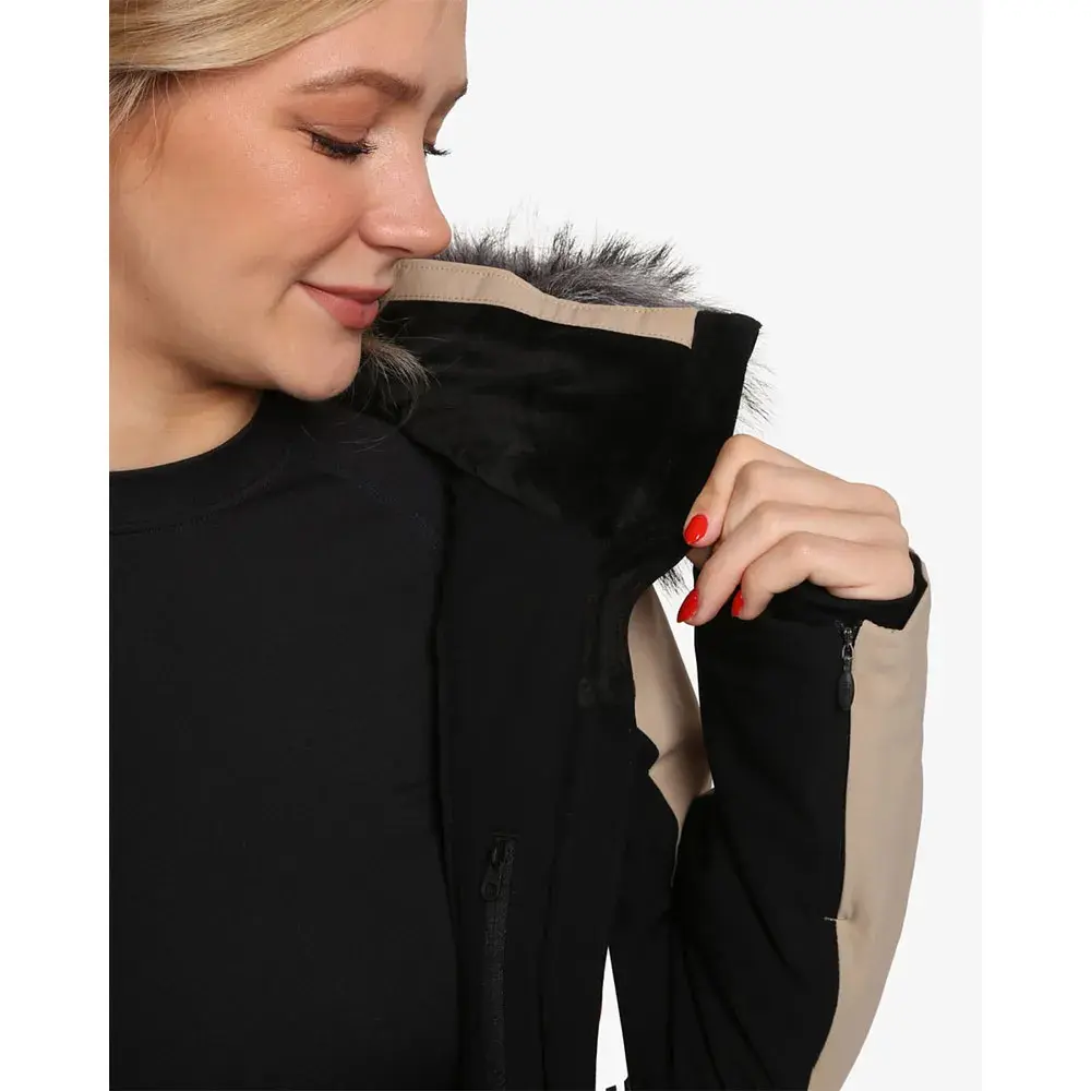 Такие детали, как мягкий микрофлис под высоким воротником и съемный капюшон с роскошным искусственным мехом, придают куртке спортивную элегантность.