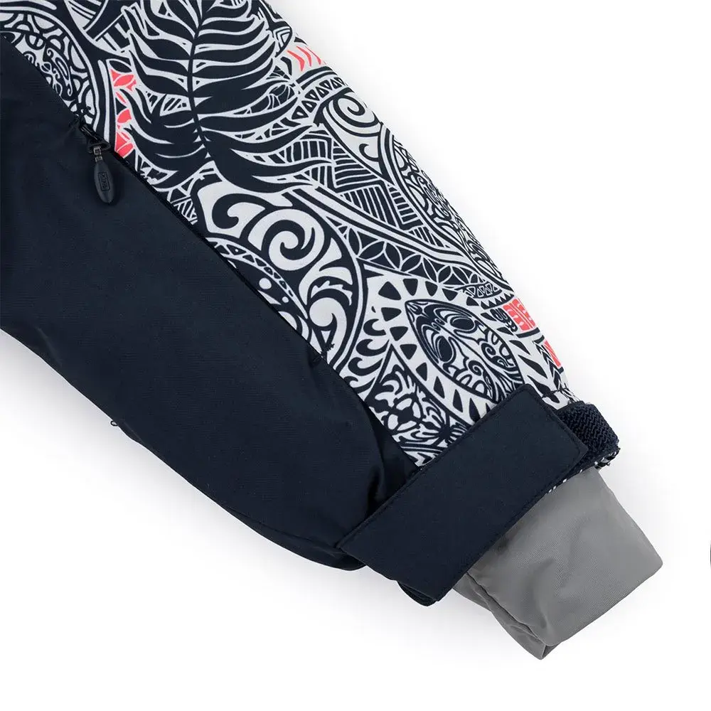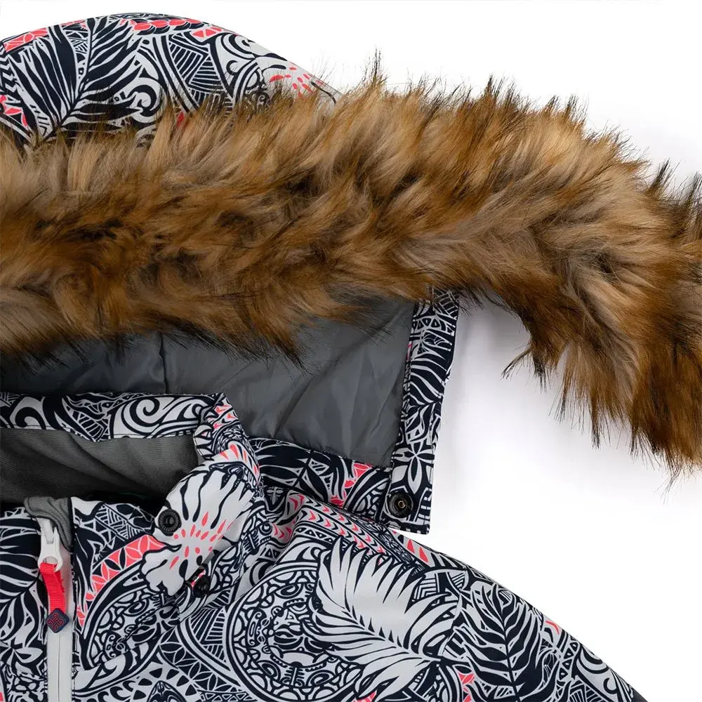 Куртка имеет два основных кармана, карман на рукаве для ски-пасса и съемный капюшон с эффектной отделкой из синтетического меха.