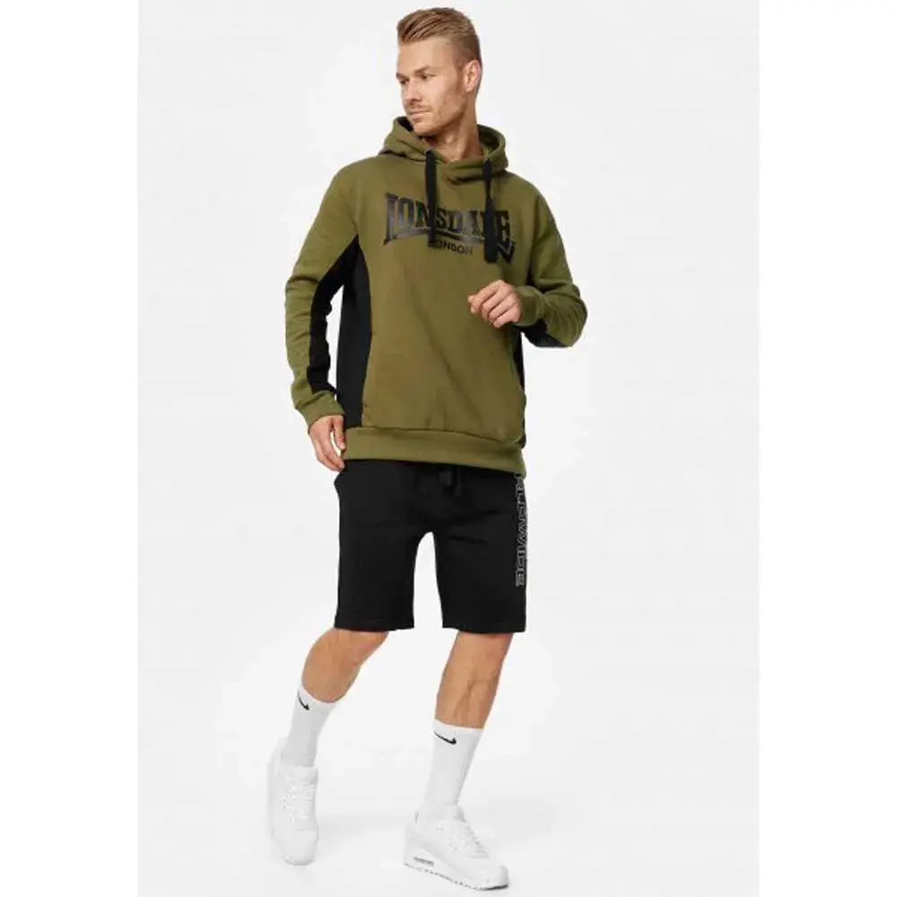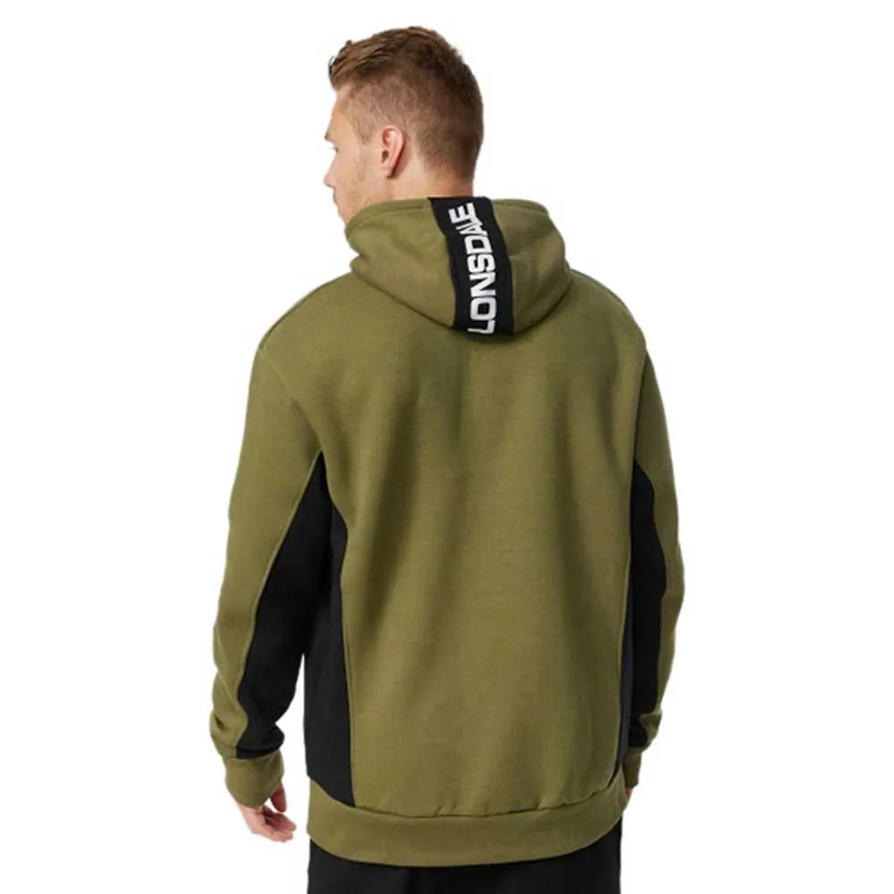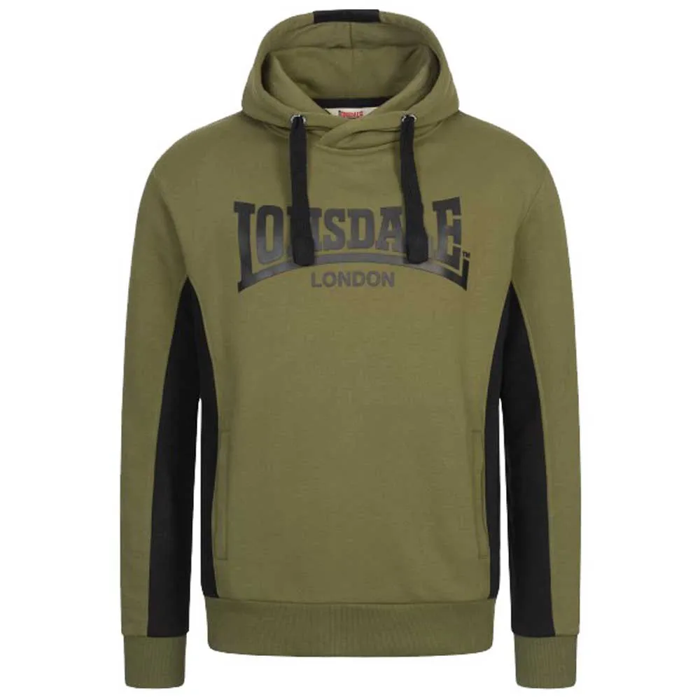 Мужская толстовка с капюшоном, стандартного кроя, с контрастными тканевыми вставками по бокам и на капюшоне. Спереди два кармана. На груди и капюшоне расположены контрастные логотипы Lonsdale.