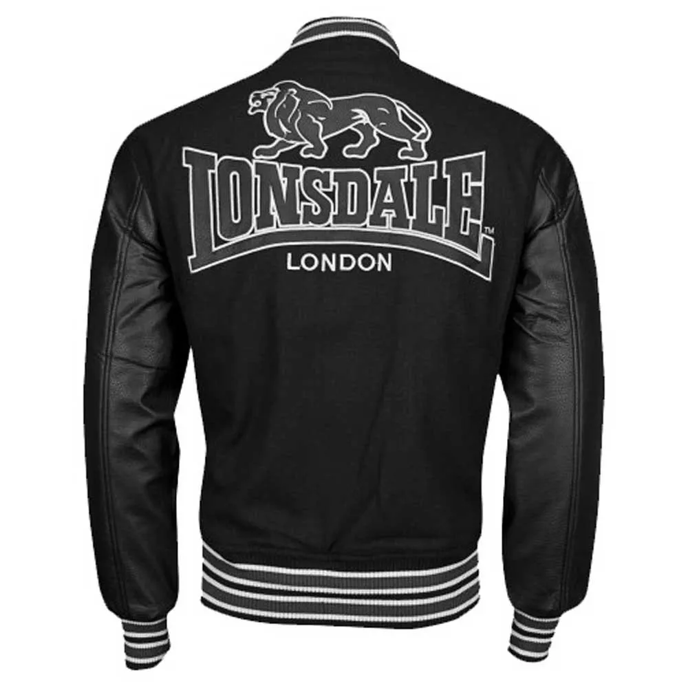Мужская студенческая куртка. Студенческая куртка с вышитыми аппликациями и полосатыми манжетами. На спине большой логотип Lonsdale в виде аппликации из искусственной кожи. Рукава выполнены из ткани, имитирующей кожу.