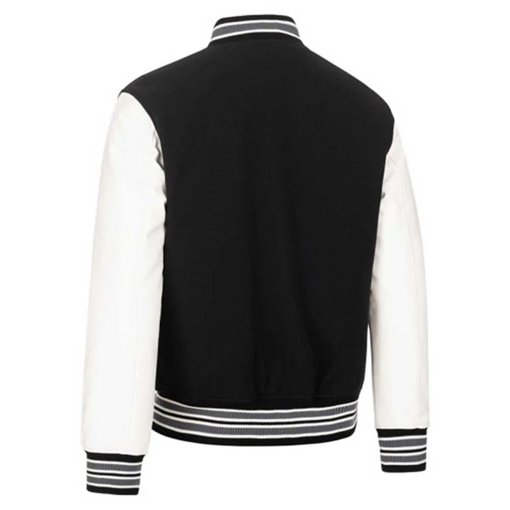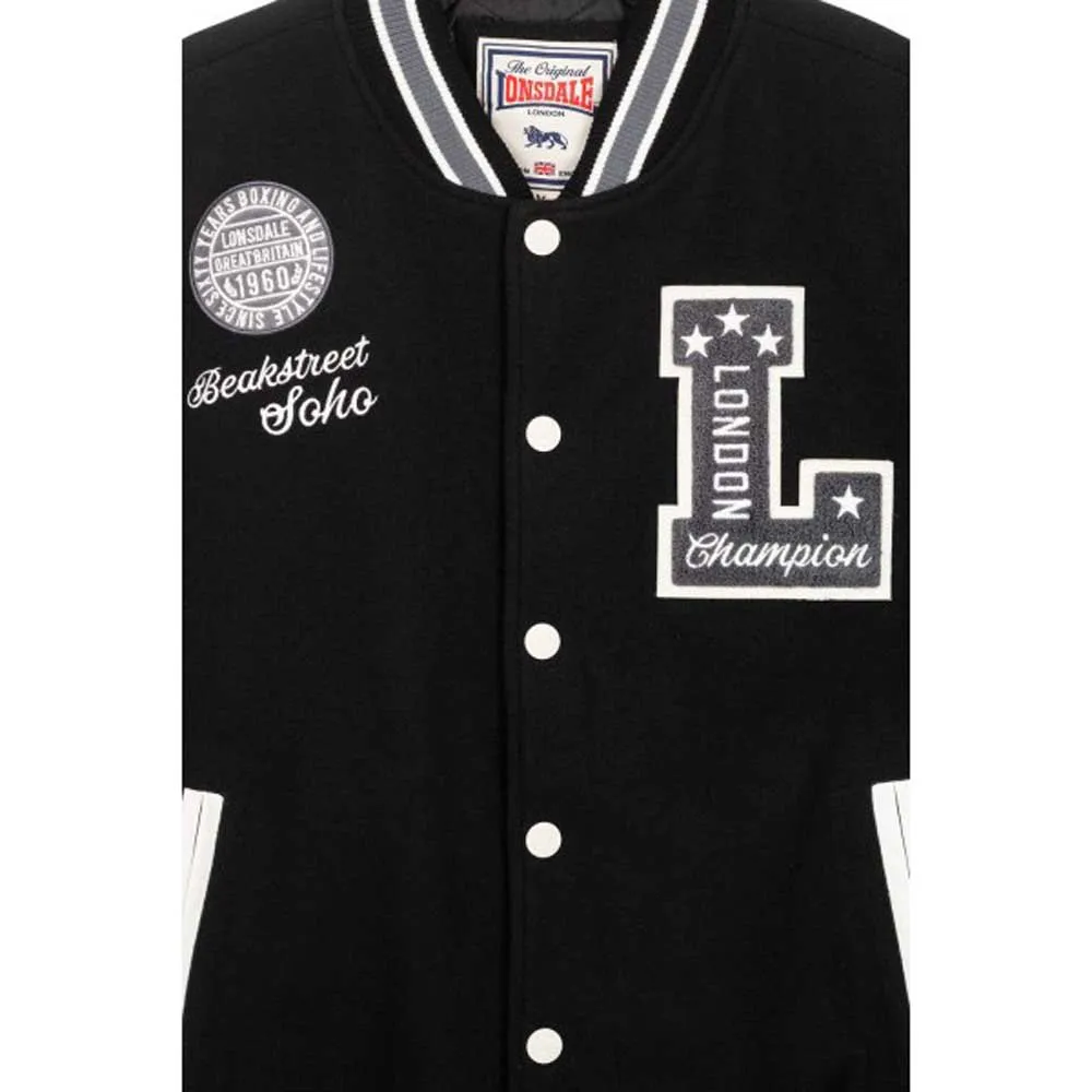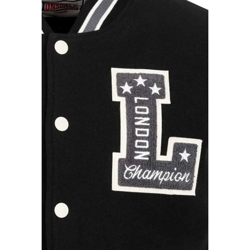 Мужская студенческая куртка. Студенческая куртка с планкой на пуговицах, вышитыми аппликациями на груди и полосатыми манжетами в рубчик. Карманы и рукава выполнены из контрастной ткани, имитирующей кожу.
