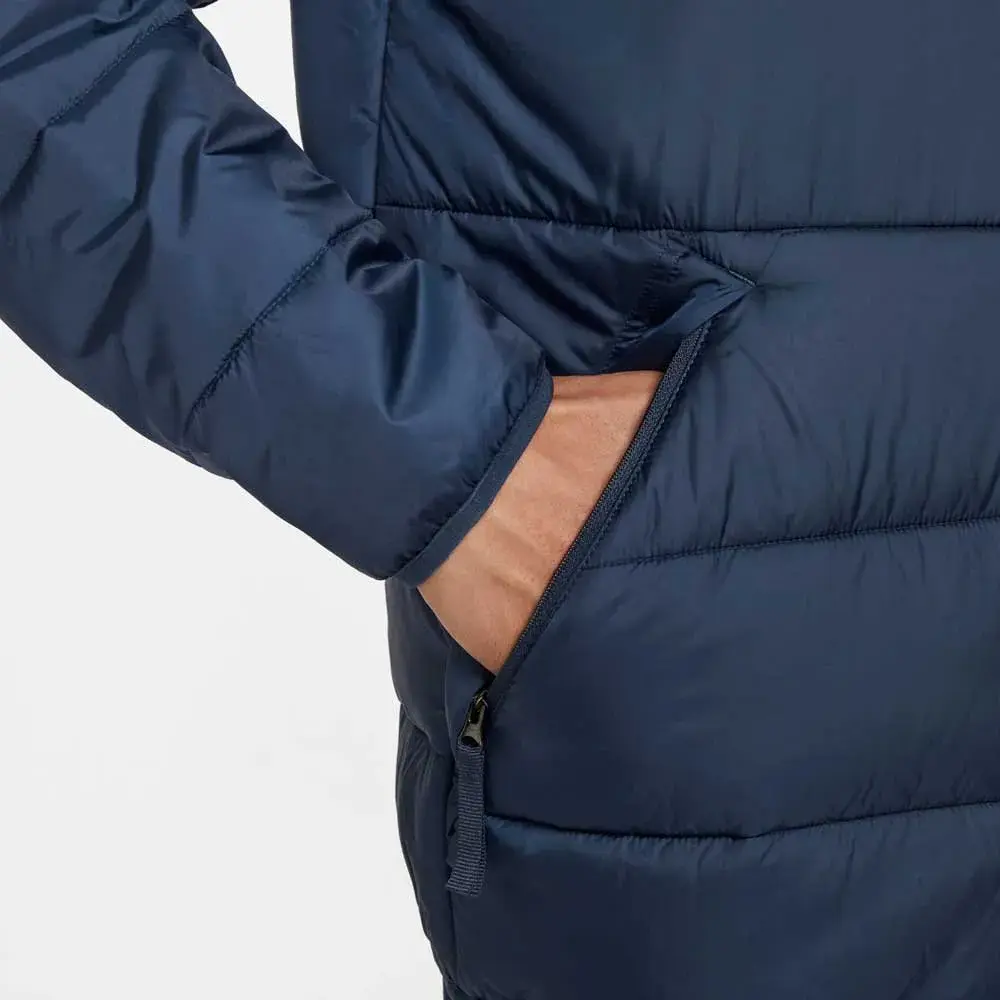 Элегантный синий дизайн дополнен фирменной символикой NIKE на груди и эффектным цветовым блоком на рукавах, что создаёт спортивный и современный образ. Застёжка-молния по всей длине и воротник-стойка обеспечивают дополнительную защиту от непогоды.