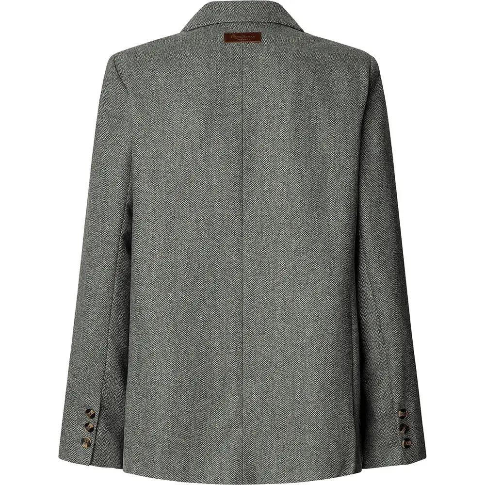 Мягкий двубортный блейзер с узором «ёлочка», двумя разрезами сзади, фирменной тисненой кожаной нашивкой по центру спины и внутренней фирменной окантовкой.