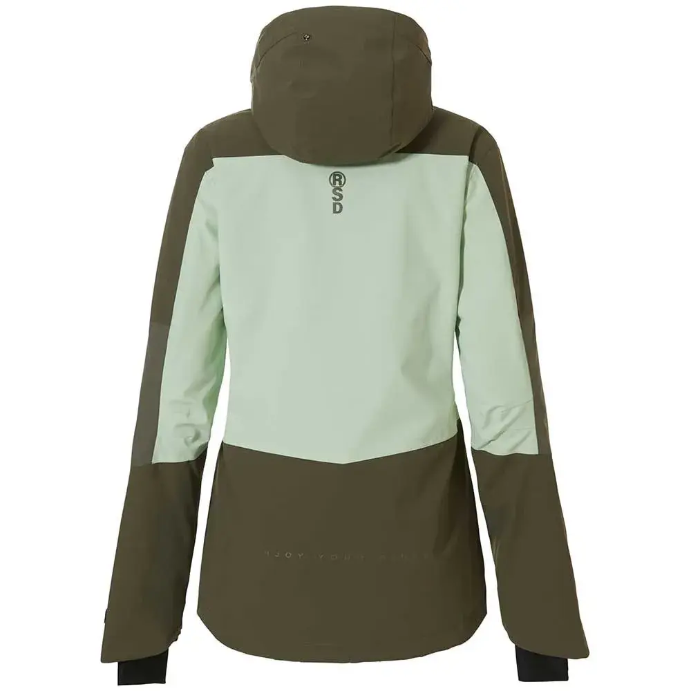 ELLY-R — женская сноубордическая куртка стандартного кроя с несколькими внутренними и внешними карманами для хранения вещей и капюшоном, который крепится к куртке, но регулируется завязками. Внутренняя подкладка изготовлена из 100% полиэстера, а внешний слой водонепроницаем 20K/20K. Куртка оснащена вентиляционными молниями под мышками и внутренней снегозащитной юбкой.