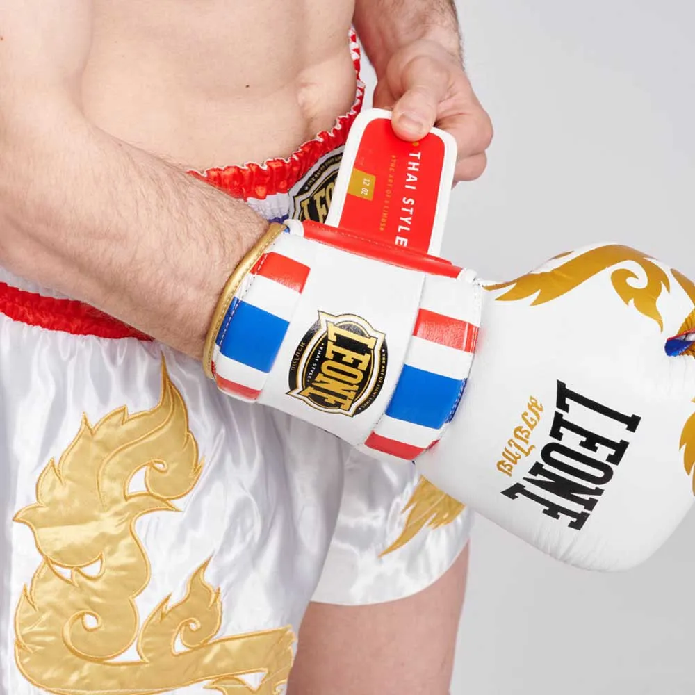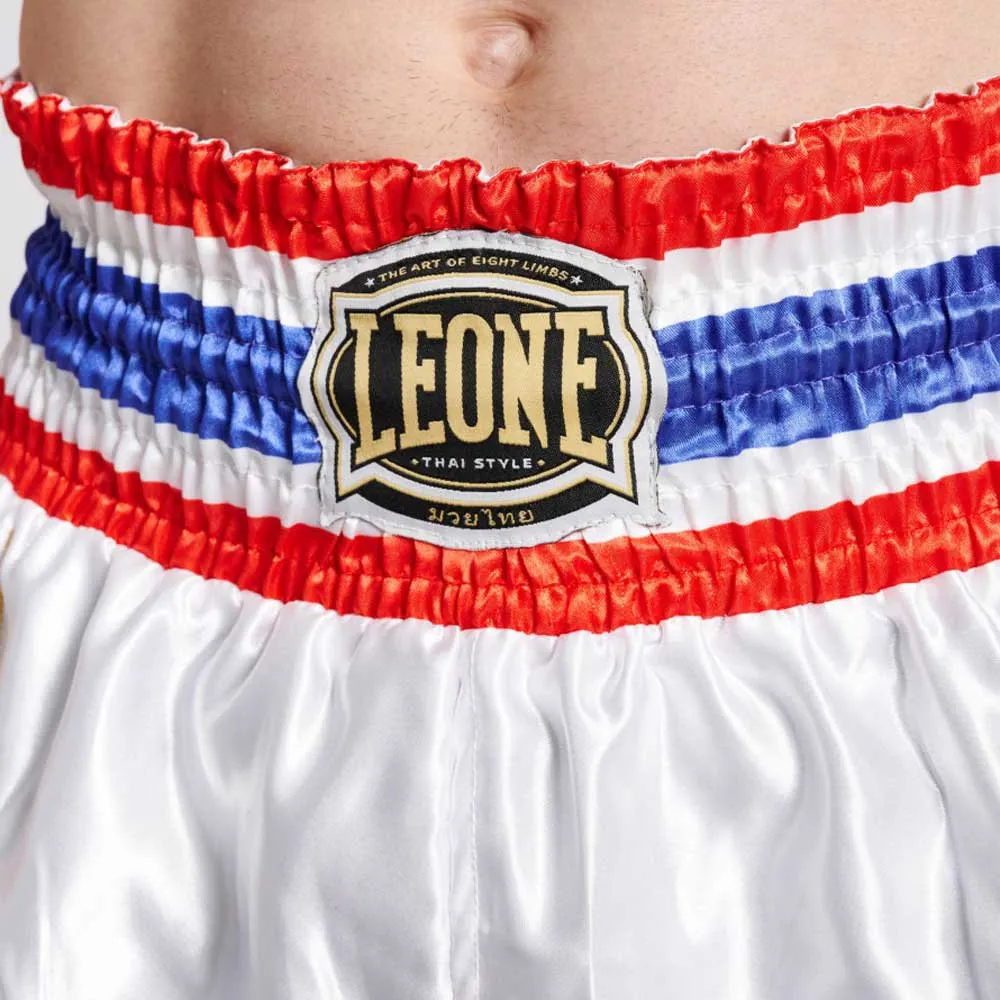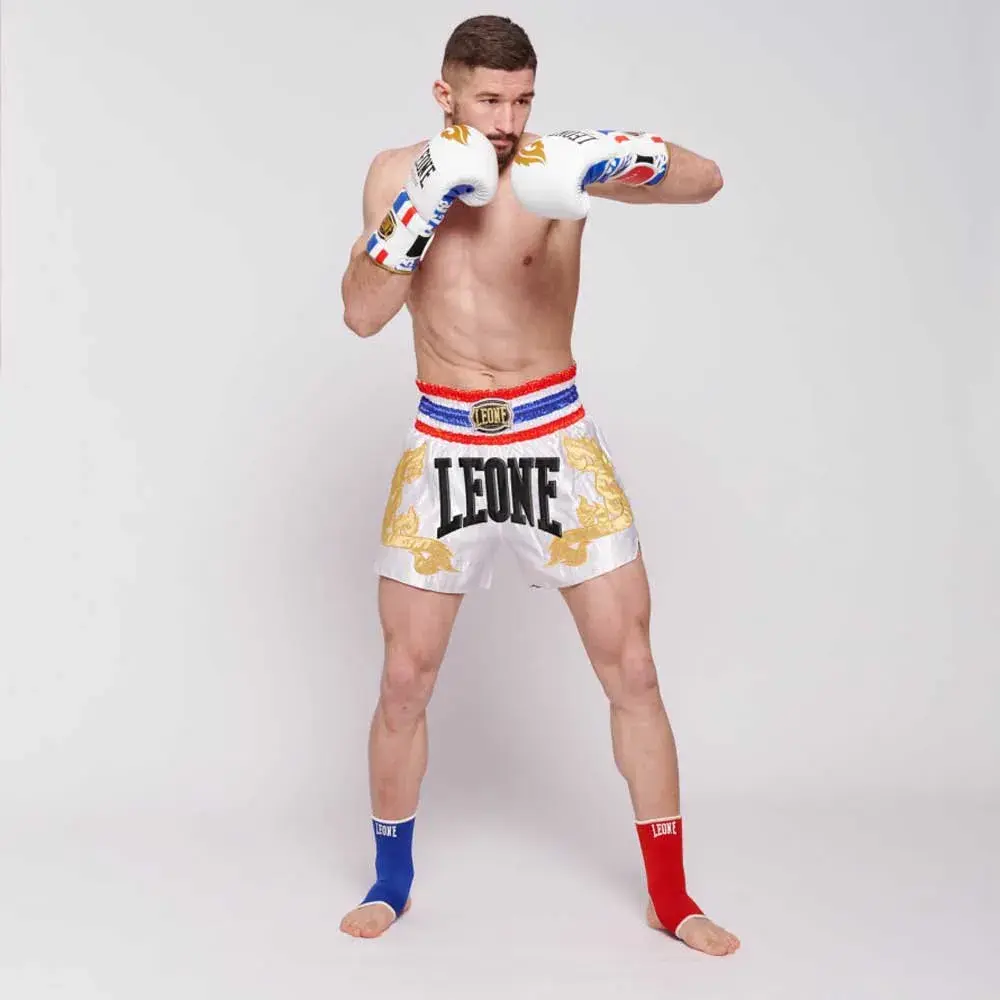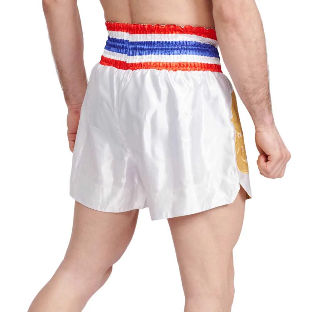 Атласные шорты в тайском стиле: несомненная отсылка к тайскому боксу благодаря тайскому флагу на талии и вышитому пламени спереди.