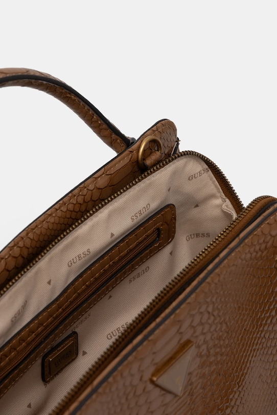 Сумка среднего размера из коллекции Guess. Модель на молнии изготовлена из искусственной кожи, которую легко чистить и ухаживать. Входящий в комплект тканевый пыльник защищает изделие от пыли.