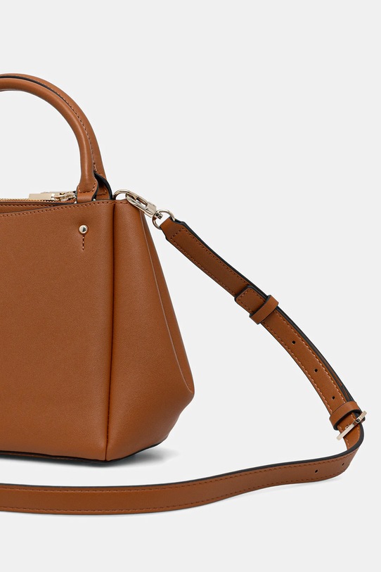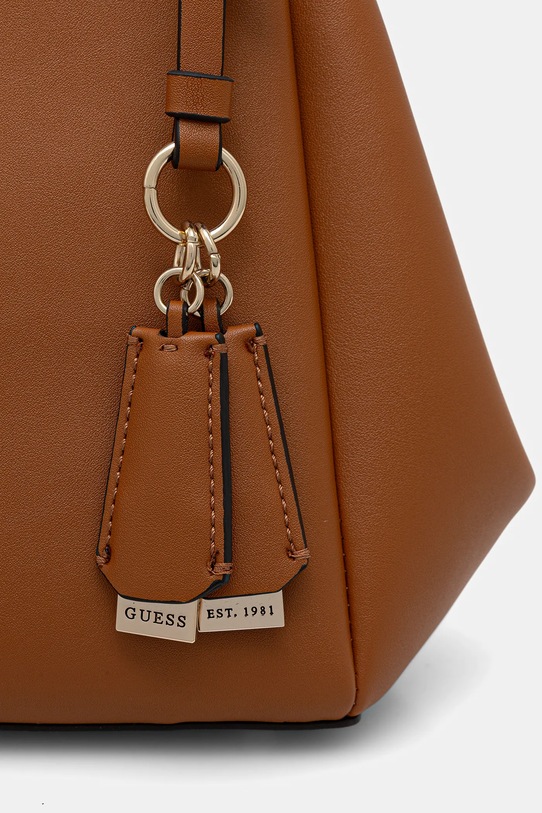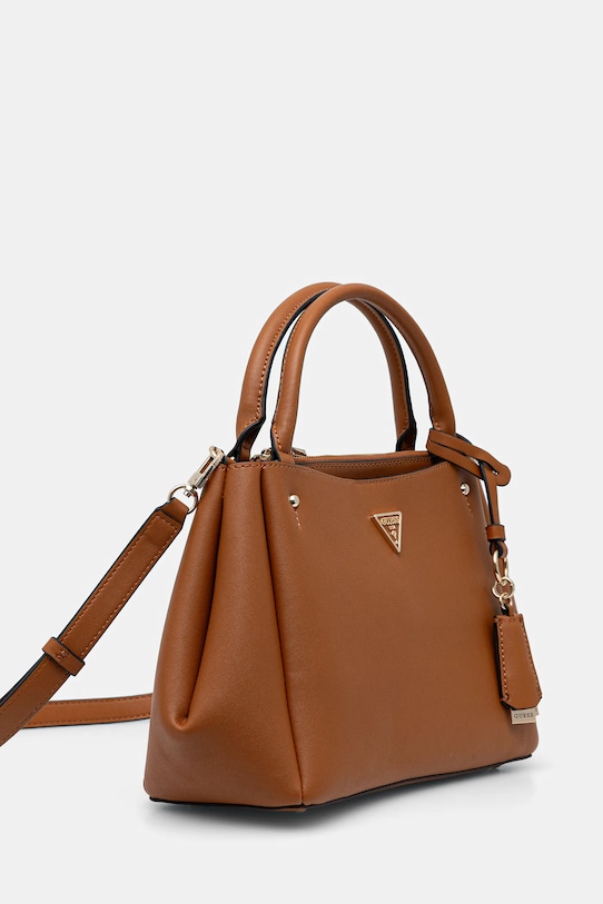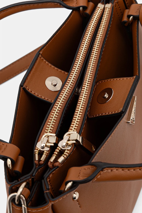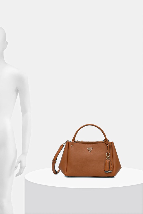Сумка среднего размера из коллекции Guess. Модель на молнии изготовлена из искусственной кожи, которая легко чистится и ухаживается. Материал плотный и хорошо держит форму. - В нем пять отделений. - Модель не имеет внутренних карманов. - Сумка для ношения в руке или на плече. - Короткие ручки. - Съемный регулируемый ремешок позволяет индивидуально подогнать посадку. - Усиленное дно сумки позволяет изделию долго сохранять форму. - Модель оснащена металлическими ножками, защищающими дно сумки. - Не подходит для формата А4. - Модель без подкладки. - Входящий в комплект тканевый чехол защищает изделие от пыли. - Количество отделений на молнии: 2. - Количество отделений с магнитным замком: 3. - Длина ручки: 34 см. - Минимальная длина ремня: 105 см. - Максимальная длина ремня: 123 см. - Глубина: 11 см. - Высота: 21 см. - Ширина у основания: 29 см. - Ширина в самом широком месте: 42 см.