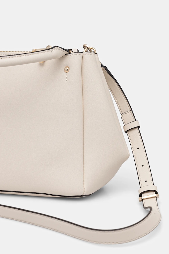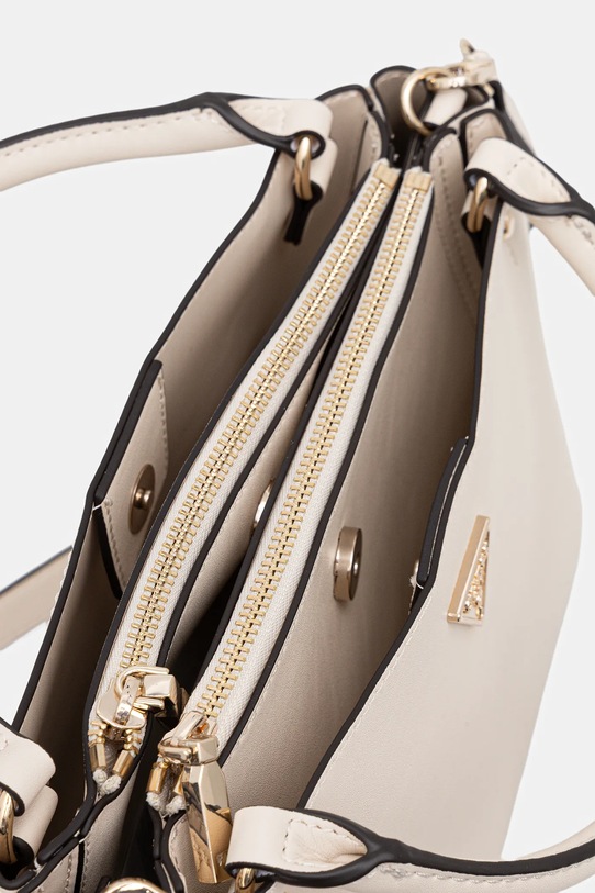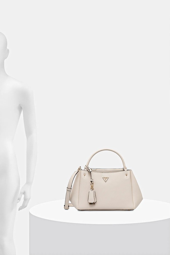 Сумка среднего размера из коллекции Guess. Модель на молнии изготовлена из искусственной кожи, которая легко чистится и ухаживается. Материал плотный и хорошо держит форму. - В нем пять отделений. - Модель не имеет внутренних карманов. - Сумка для ношения в руке или на плече. - Короткие ручки. - Съемный регулируемый ремешок позволяет индивидуально подогнать посадку. - Усиленное дно сумки позволяет изделию долго сохранять форму. - Модель оснащена металлическими ножками, защищающими дно сумки. - Не подходит для формата А4. - Модель без подкладки. - Входящий в комплект тканевый чехол защищает изделие от пыли. - Количество отделений на молнии: 2. - Количество отделений с магнитным замком: 3. - Длина ручки: 34 см. - Минимальная длина ремня: 105 см. - Максимальная длина ремня: 123 см. - Глубина: 11 см. - Высота: 21 см. - Ширина у основания: 29 см. - Ширина в самом широком месте: 42 см.