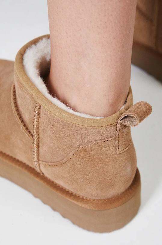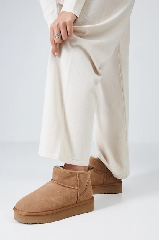 Зимние ботинки из коллекции Medicine. Изготовлены из замши. - Модель выполнена из замши, которая со временем адаптируется к форме стопы, повышая комфорт использования. - Внутренняя часть наполнена мягкой и пушистой подкладкой из смеси шерсти и синтетического материала, которая обеспечивает тепловой комфорт и удобство. - Жесткий задник стабилизирует пятку и удерживает ногу в обуви, не давая ей выскальзывать во время движения. - Удобная стелька из смеси шерсти и синтетического материала. - Подошва изготовлена из комбинации мягкого пеноматериала EVA и резины. - Платформенная модель. - Петля сзади облегчает надевание и снятие обуви. - Изолированная модель. — При первой примерке обувь должна плотно облегать ногу, так как внутренняя часть естественным образом сжимается. Если выбрать слишком свободный размер, обувь может оказаться слишком широкой. - Длина вставки: 24,5 см. - Размеры указаны для размера: 38.