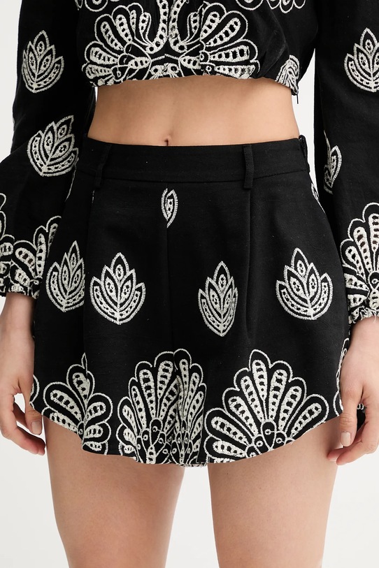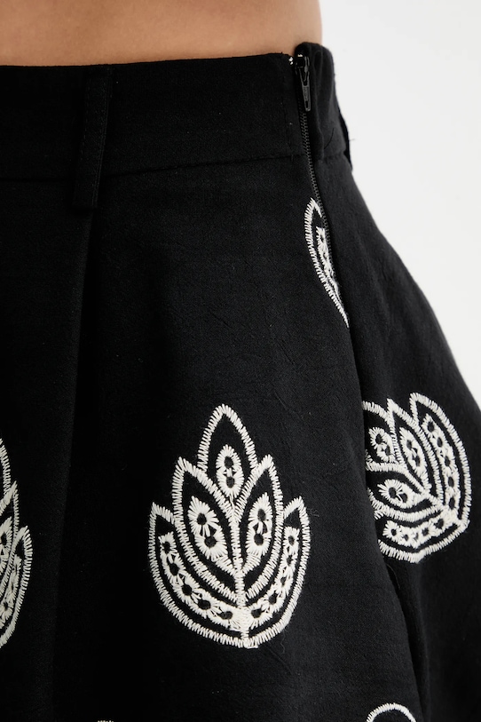 Блузка и шорты из коллекции Answear.LAB выполнены из тонкой, неэластичной ткани. Содержание полиэстера делает материал менее мнущимся. - Приталенный верх и расклешенный низ. - Дополнительный слой материала в виде подкладки спереди. - Декоративный, заостренный вырез. - Длинные рукава с удобными эластичными манжетами. - Застегивается сбоку на потайную молнию. - Нижний край отделан эластичной резинкой, благодаря чему изделие лучше прилегает к телу и удобно в носке. - Свободные шорты в области бедер и ягодиц. - Модель с высокой талией и застежкой-молнией. - Расклешенные штанины. - Материал со складками. - Модель с декоративной вышивкой. - Длина: 38 см. - Ширина под мышками: 45 см. - Ширина талии: 35 см. - Ширина бедер: 56 см. - Высота талии: 32 см. - Ширина штанины: 44 см. - Длина внешней части штанины: 32 см. - Размеры указаны для размера: S.