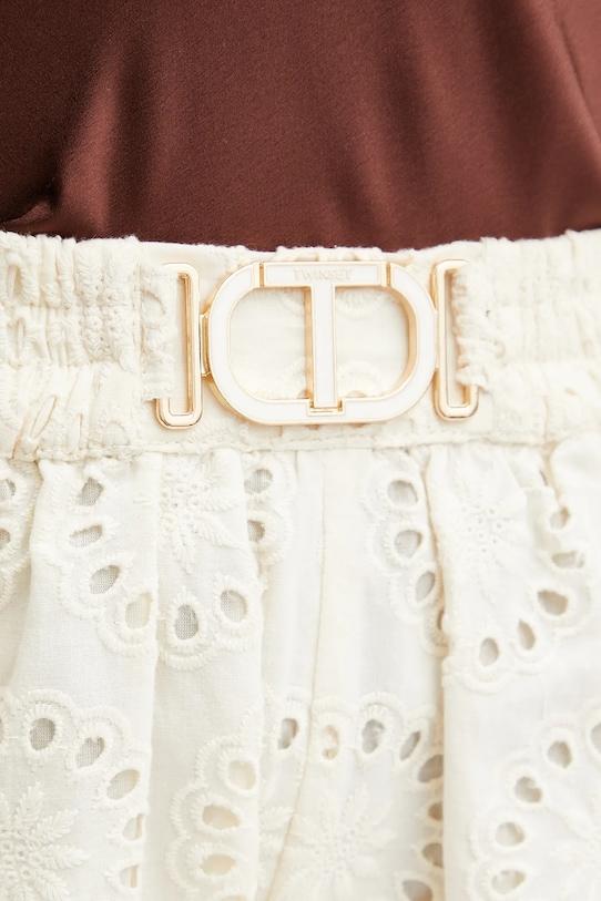 Шорты из коллекции Twinset, выполненные из ткани с декоративной вышивкой. Изготовлены из дышащего хлопкового материала. - Свободные шорты в области бедер и ягодиц. - Высокая талия обеспечивает комфорт во время занятий спортом и позволяет визуально стройнить фигуру. - Эластичный пояс предотвращает скольжение во время движения. - Расклешенные штанины. - Два боковых накладных кармана. - Дополнительный слой материала в виде подкладки. - Ширина талии: 32 см. - Ширина бедер: 65 см. - Высота талии: 34 см. - Ширина штанины: 43 см. - Длина внешней части штанины: 35 см. - Размеры указаны для размера: 36.