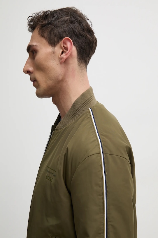 Куртка-бомбер из коллекции BOSS. Эта лёгкая утеплённая куртка выполнена из гладкой ткани. Синтетический утеплитель обеспечивает дополнительный комфорт в прохладную погоду. - Изделия линейки BETTER BOSS не менее чем на 60% изготовлены из материалов, полученных более экологичным способом. - Простой дизайн, не стесняющий движений. - Легкоутепленная модель с подкладкой. - Длинный рукав. - Рукава и низ изделия отделаны манжетами для защиты от неблагоприятных погодных условий. - Удобная застежка-молния позволяет легко надевать и снимать. - Два боковых кармана с застежкой на кнопку. - Внутренний карман на молнии позволяет безопасно хранить мелкие предметы. - Графический логотип бренда спереди. - Длина рукава: 64 см. - Длина: 68 см. - Ширина под мышками: 58 см. - Ширина плеч: 50 см. - Размеры указаны для размера: 48.